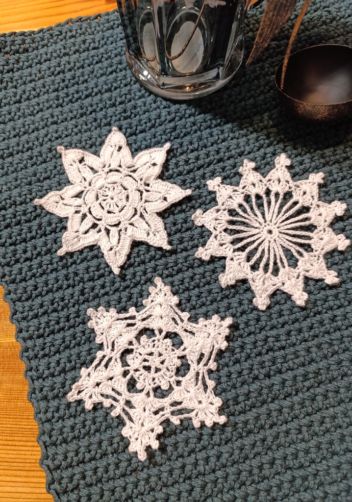 Háčkovaná vločka z tenké bavněné příze. Každá vločka je naškrobená a vypnutá, aby držela tvar.