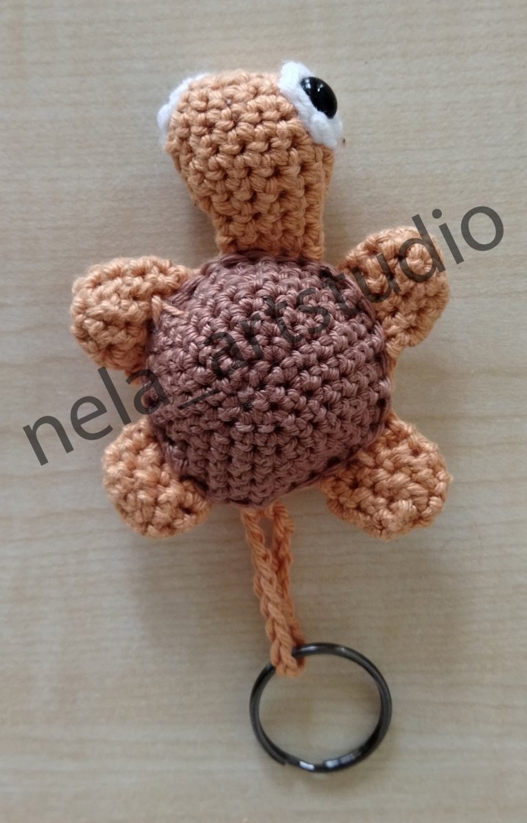 Háčkovaná háčkem 3,0 mm, vyplněna dutým vláknem. Obsahuje 2 ks černých očí s bezpečnostní zarážkou proti vypadnutí. Je doplněna krátkým řetízkem s kroužkem k zavěšení.