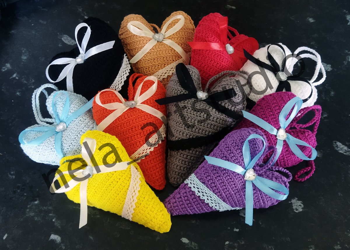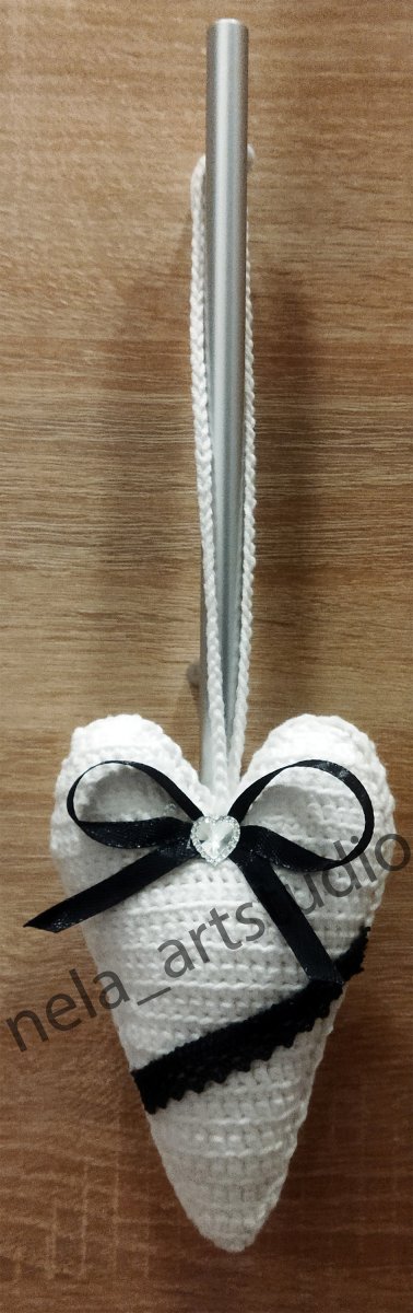 Vyplněno dutým vláknem. Zdobeno atlasovou stuhou 6mm, broušeným srdcem a bavlněnou paličkovanou krajkou a řetízkovou šňůrkou na zavěšení.