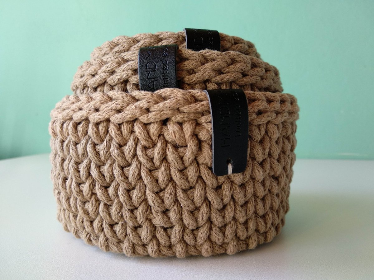 Košíčky jsou uháčkované z bavlněných špagátů, zdobené dřevěným knoflíkem nebo cedulkou nebo černým štítkem.