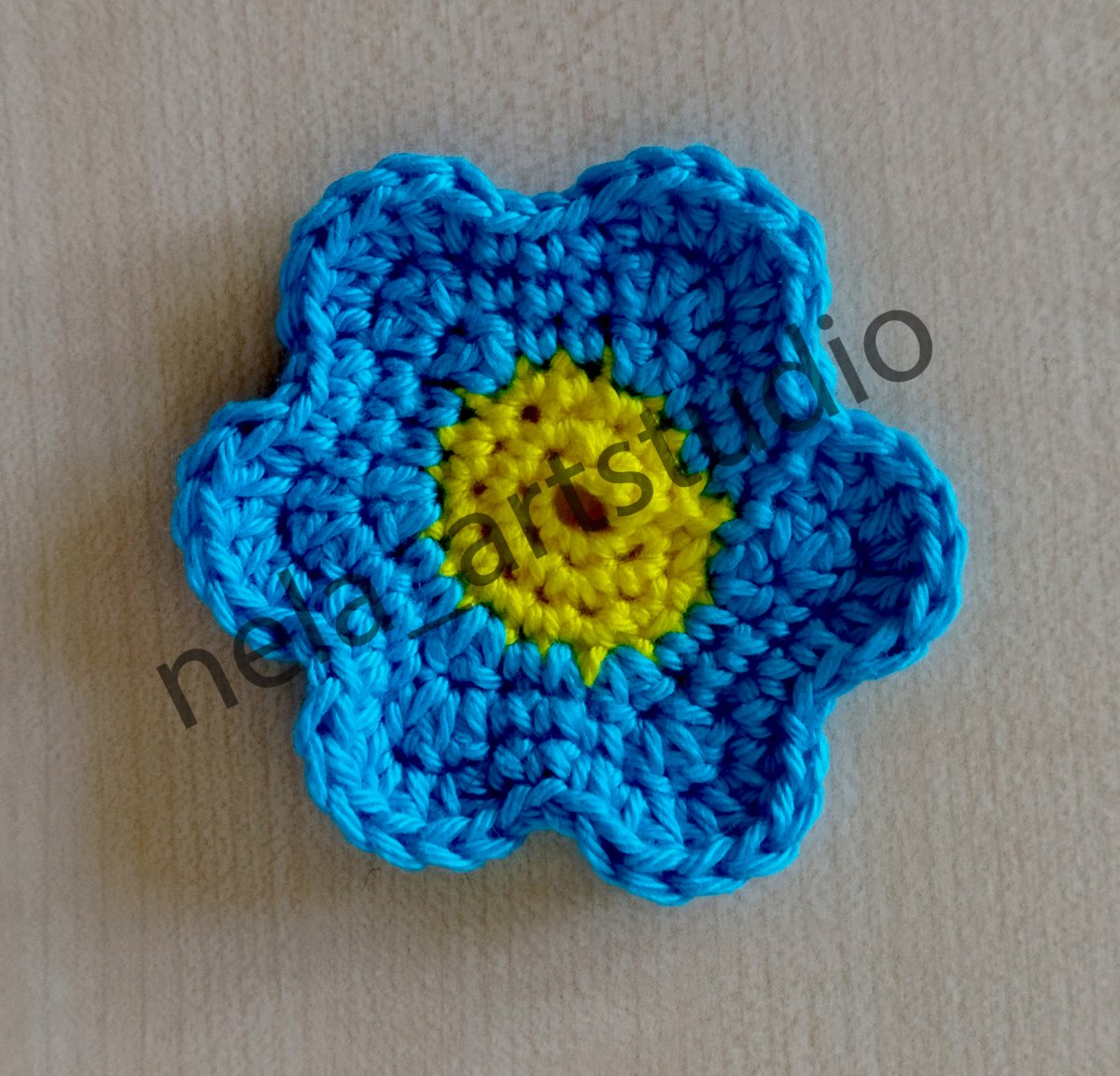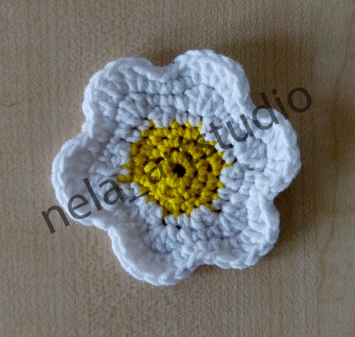 Ručně háčkovaná kytička. Ideální jako stylový doplněk nebo dekorace. Vhodné k ozdobení oblečení (čepic, šatiček, svetříků, kabelek apod.)