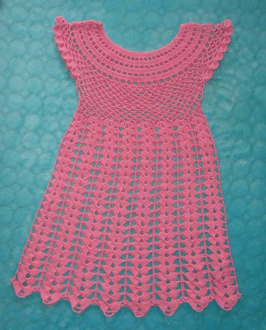 Háčkované šatičky pro velikost 2-3 roky, háčkované z příze Camila, šíře šatiček nahoře na ramenou 38cm, šířka přes hrudníček 28cm, celková délka 58cm, šíře dole 58cm, obvod hlavičky dítěte cca 49cm (pro přetažení šatiček přes hlavu).