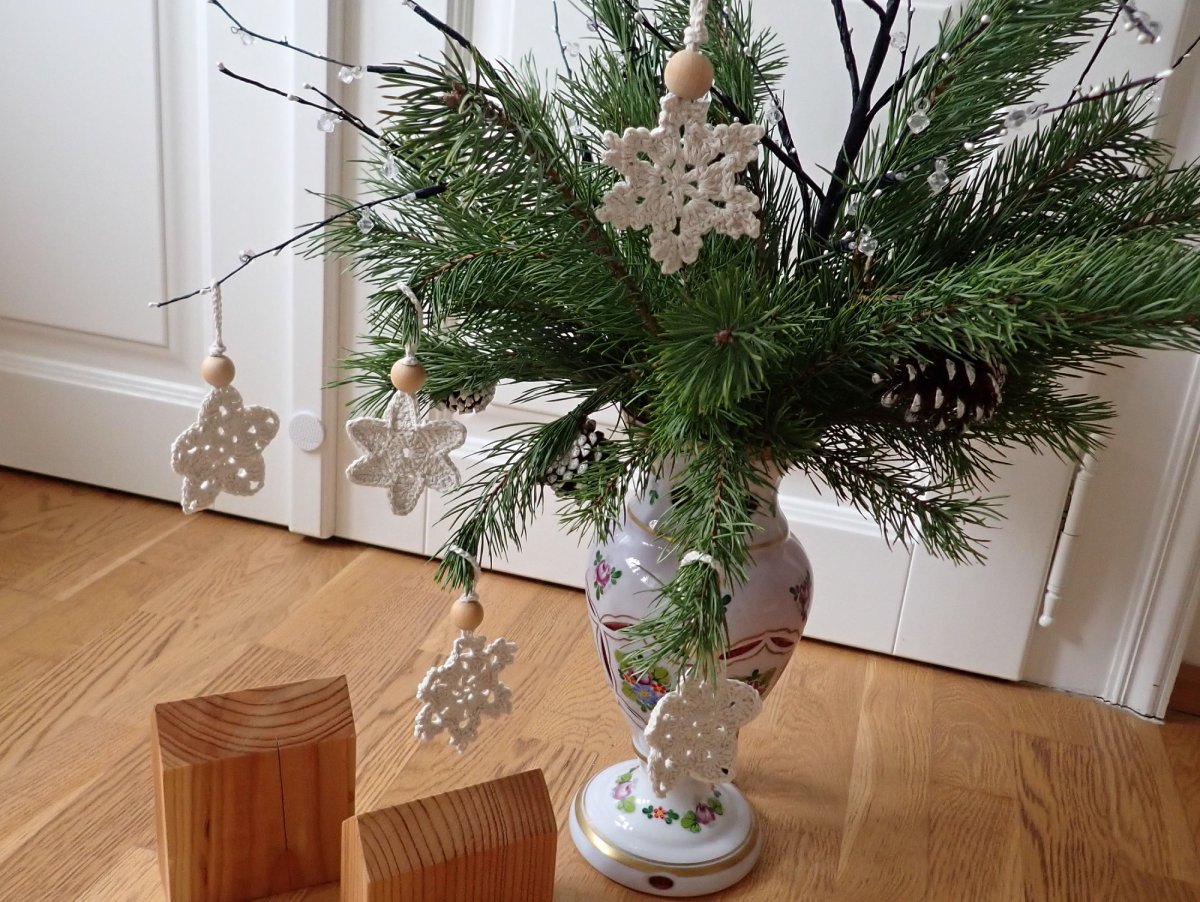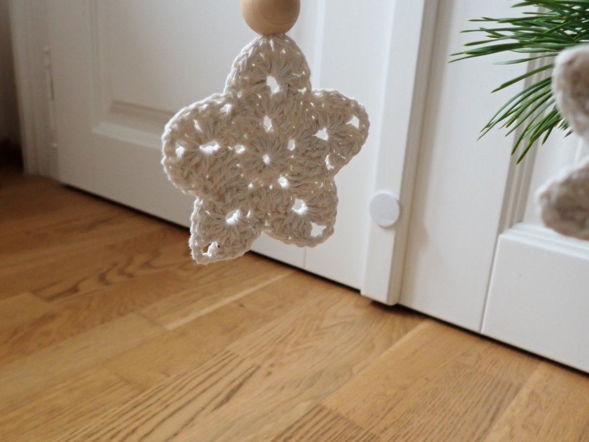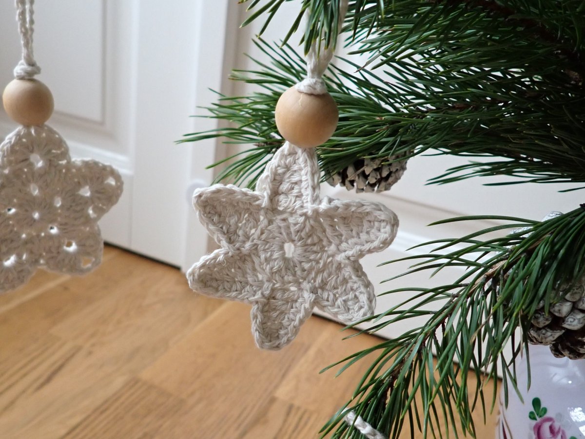 Pevné přírodní dekorace - vločky jsou uháčkované z bavlněného provázku a doplněné přírodním dřevěným korálkem.