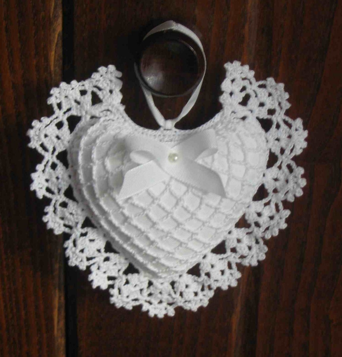 Háčkované srdíčko - vnitřní část srdíčka je ušita ze 100% bavlny vyplněna dutým vláknem. Vrchní část je uháčkována ze 100%bavlny krajkovým vzorem dozdobena mašličkou a perličkou. Velikost srdíčka je 11cm x 11cm.