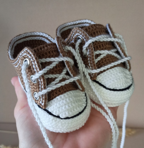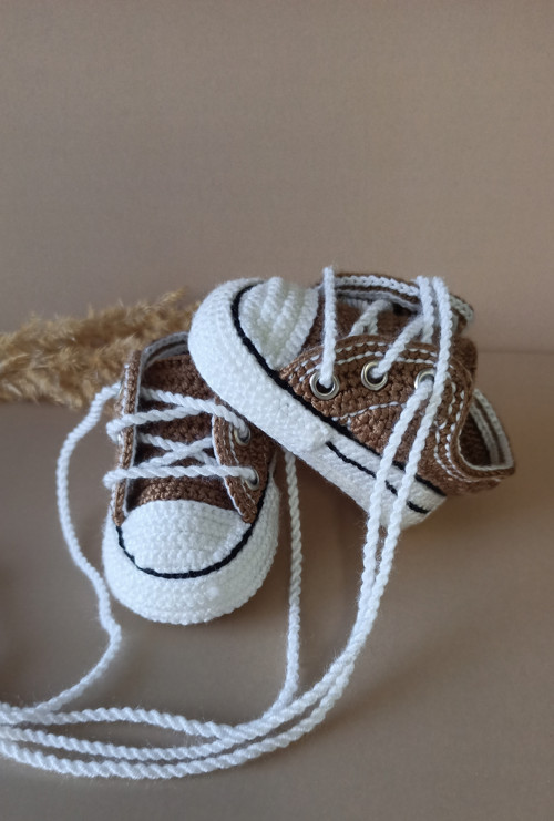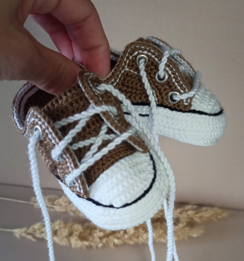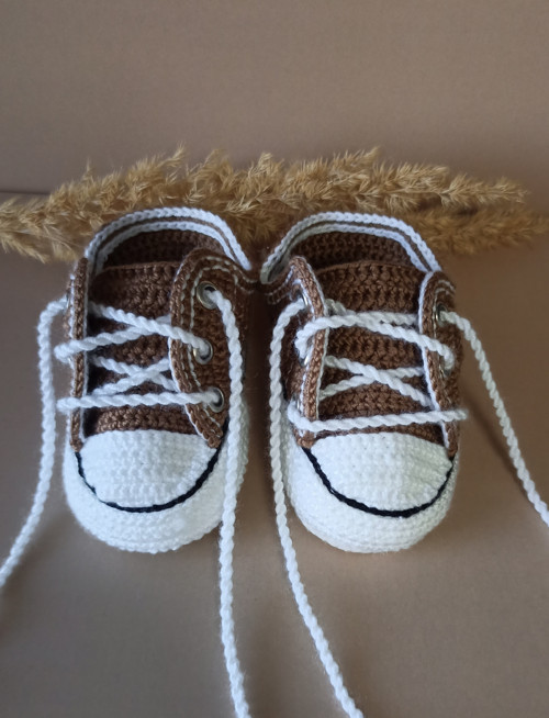 Ručně háčkované hnědé tenisky v kombinaci s bilou. Botičky jsou perfektní jako dárek pro miminko, na focení....