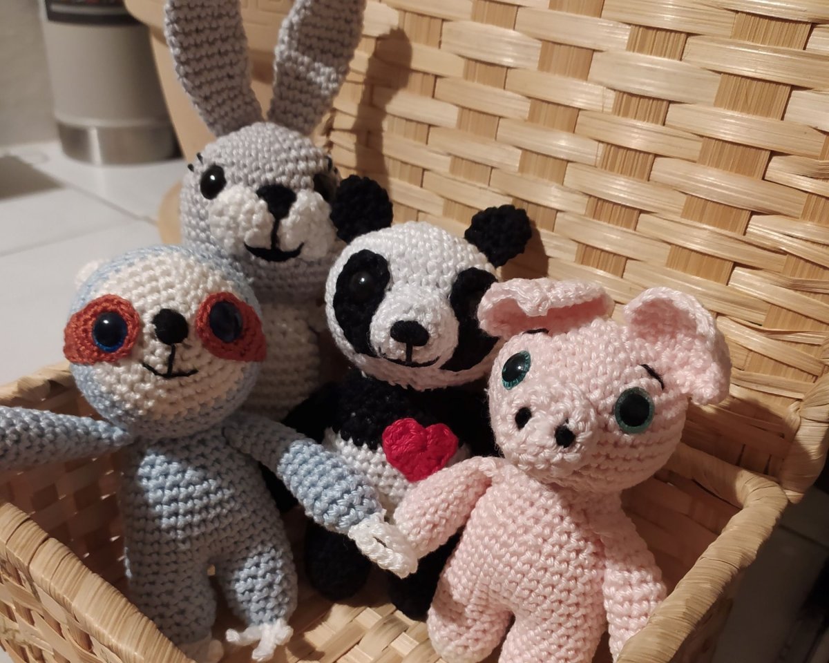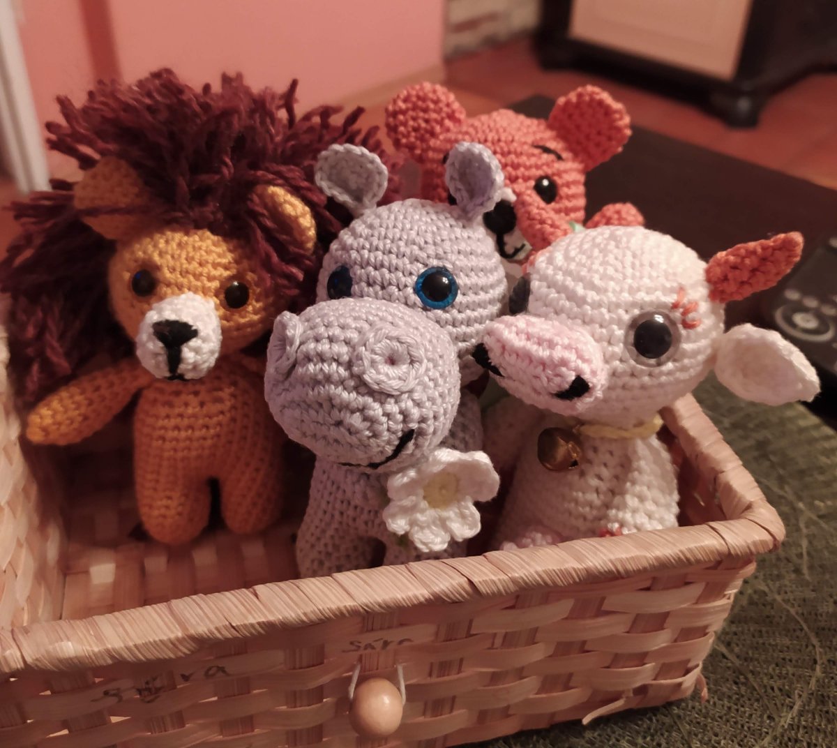 Háčkovaná zvířátka ze 100% bavlněné příze, bezpečnostní očka. Velikost cca 12 cm.