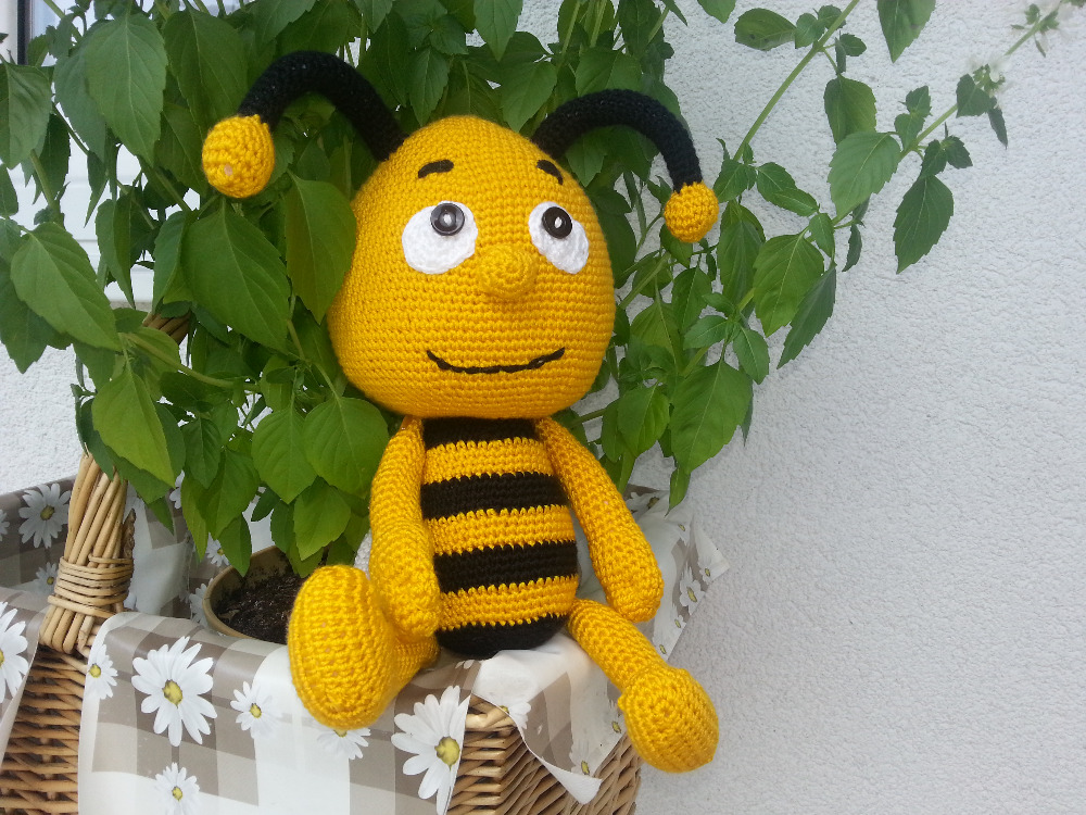 Čmeláčka Edu jsem háčkovala ze 100% akrylu, a to do výšky 40 cm včetně tykadel. Vyplnila jsem ho dutým vláknem. Lze prát na 40%.