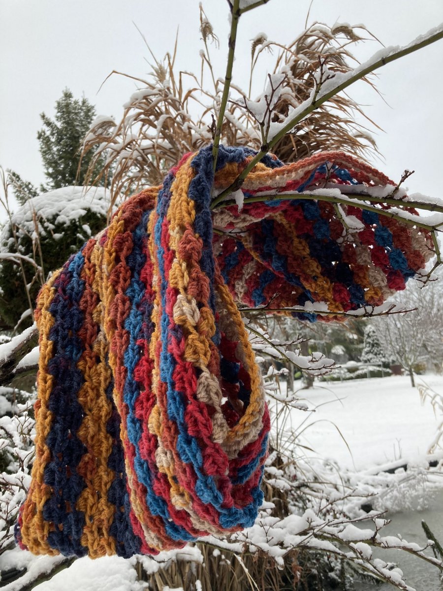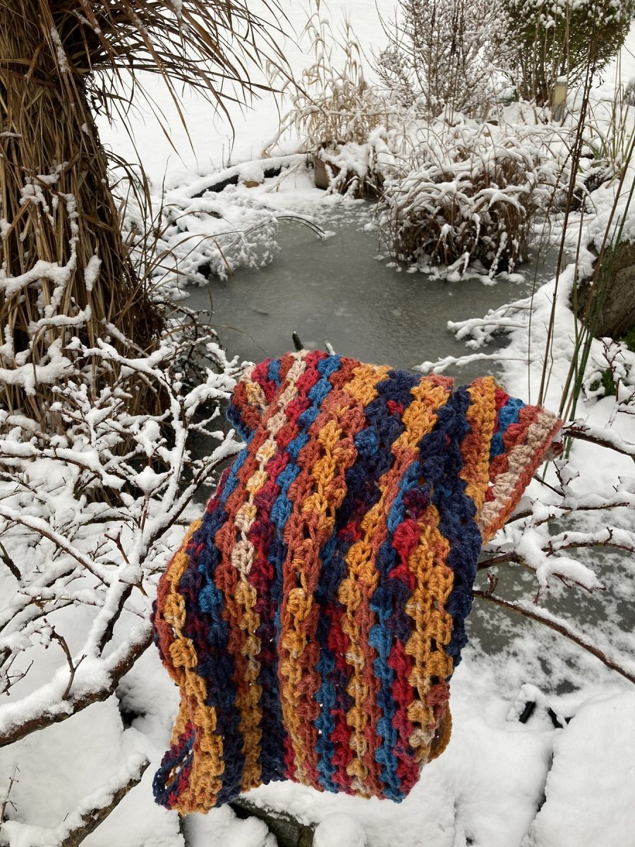 Háčkovaný nákrčník z příjemné akrylové příze. Divoké barvičky, dvojí omotání... Zahřeje a rozparádí!