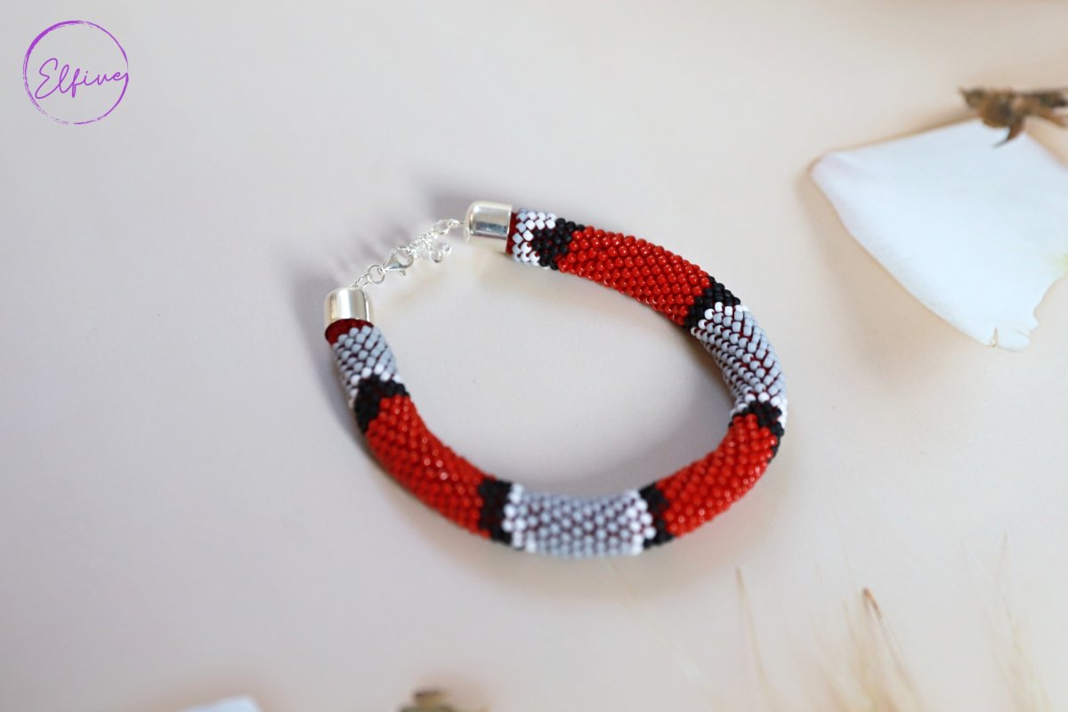Háčkovaný náramek je vyroben z kvalitních TOHO korálků se vzorem kůže hada korálovky.