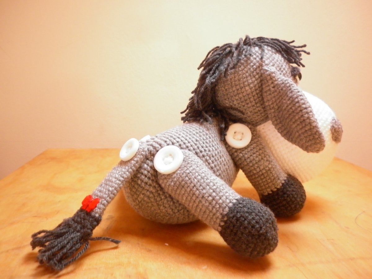 Oslík je vysoký 25 cm (bez ocásku), je háčkovaný z akrylové dětské příze, vyplněný protialergickým dutým vláknem a má bezpečnostní očička. Nohy jsou přišity pomocí knoflíků, což zaručuje jejich pohyb.