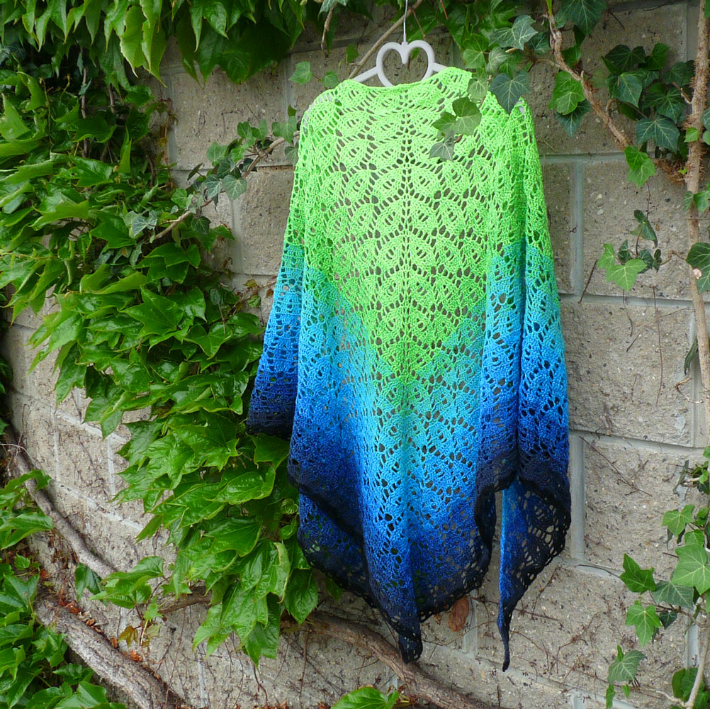 Háčkovaný velký šátek/pléd v zelenomodrých barvách