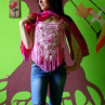 Přední i zadní díl má stejný srdíčkový vzor, přední díl je navíc ozdoben korálky, mušličkami, copánky upletenými ze stejné příze, zrcátkem a rolničkami. Spodní lem zdobí třásně.