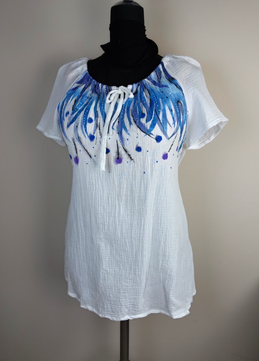 Mušelínová halenka bílé barvy na obrázku s abstraktní malůvkou. Halenka má klasický Ačkový střih,dekolt si regulujete šňůrkou - oblíbený střih.