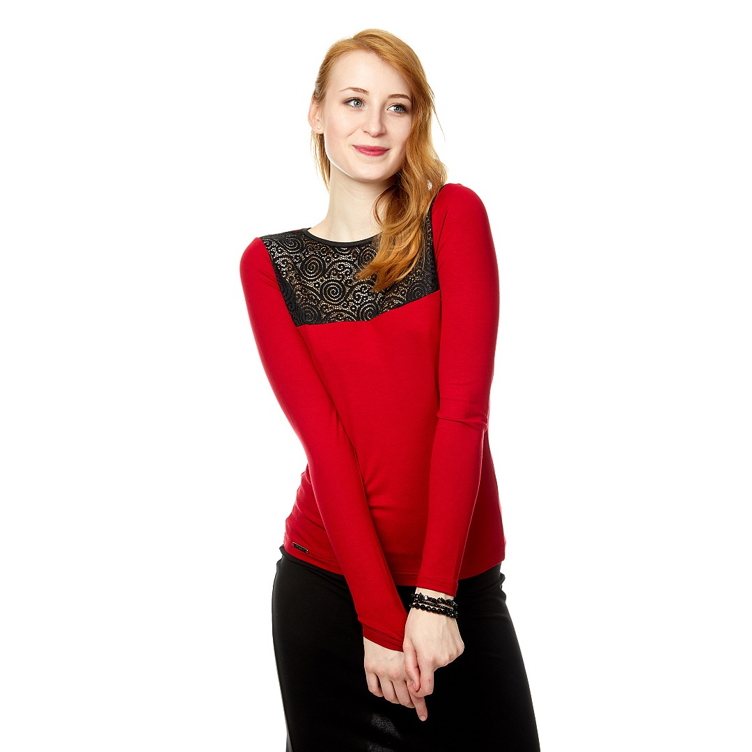 Společenská halenka v krásné, rubínové barvě v kombinaci s černou, elastickou krajkou je zhotovena z vysoce kvalitního, přírodního úpletu. Krásně splývá, obsahuje hodně elastanu.