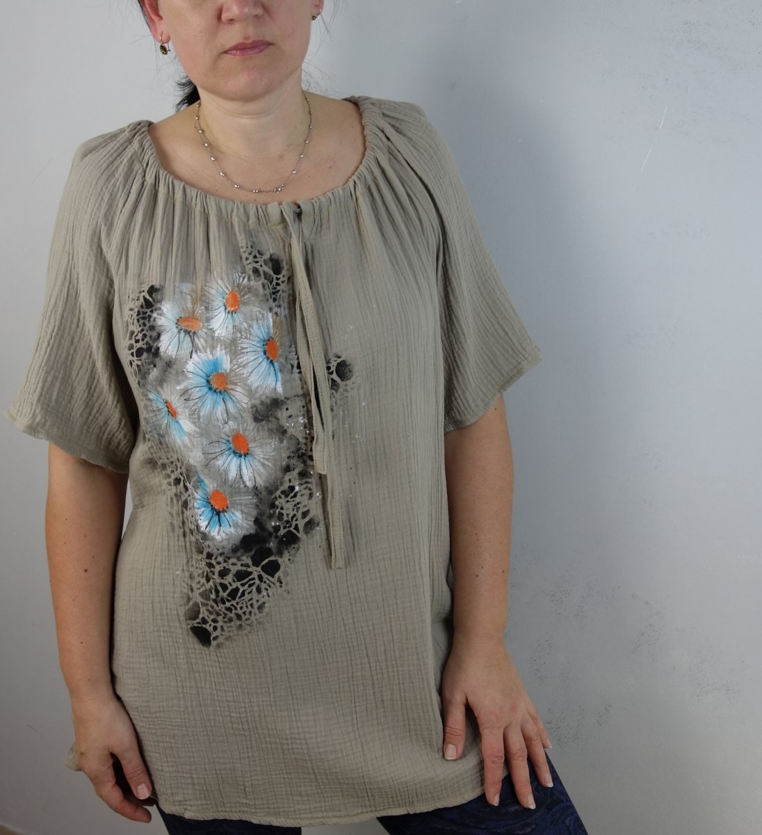 Mušelínová halenka na stahování dekoltu dle potřeby .... klasický Ačkový střih, vzorované rukávy a ruční malůvka na předním díle.