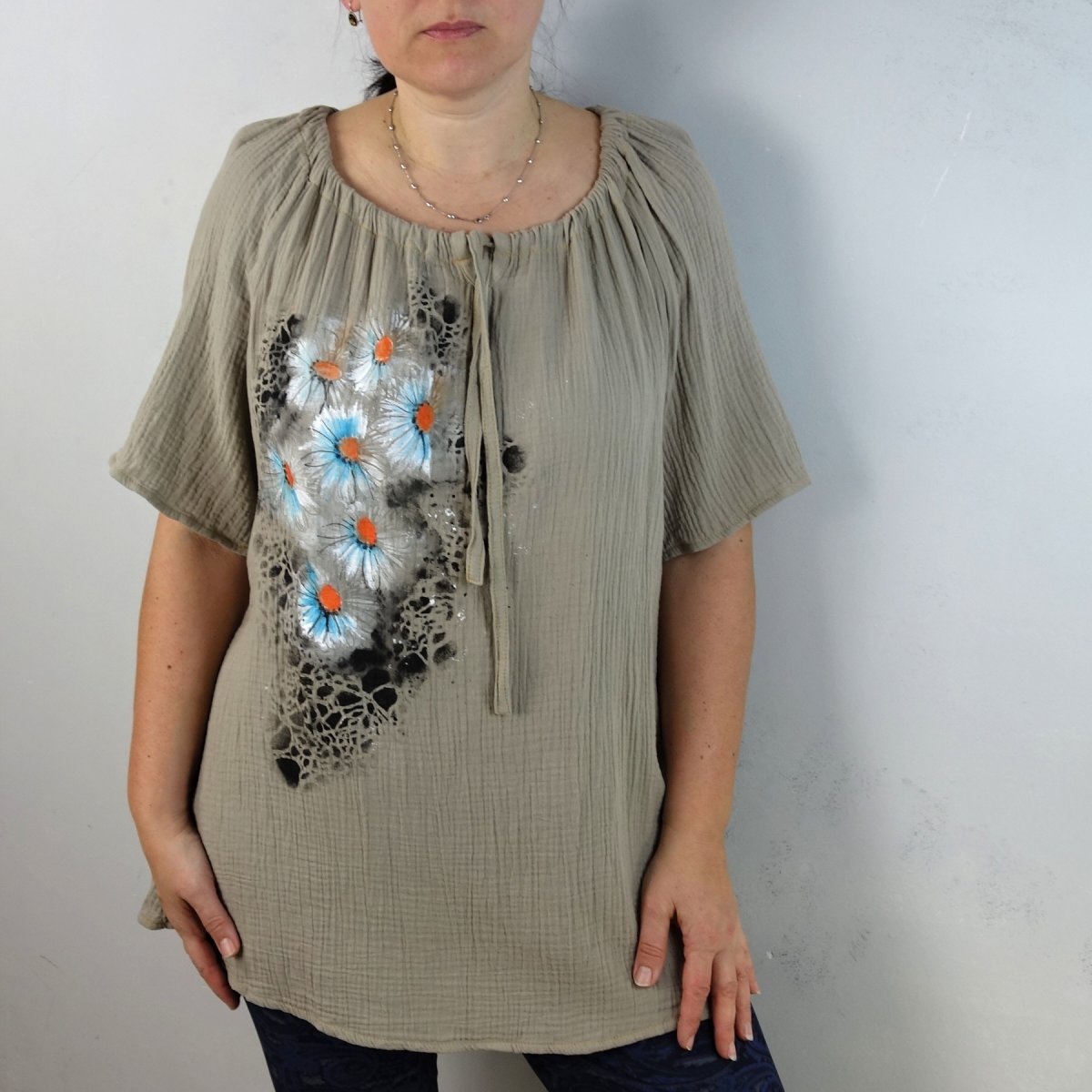 Mušelínová halenka na stahování dekoltu dle potřeby .... klasický Ačkový střih, vzorované rukávy a ruční malůvka na předním díle.