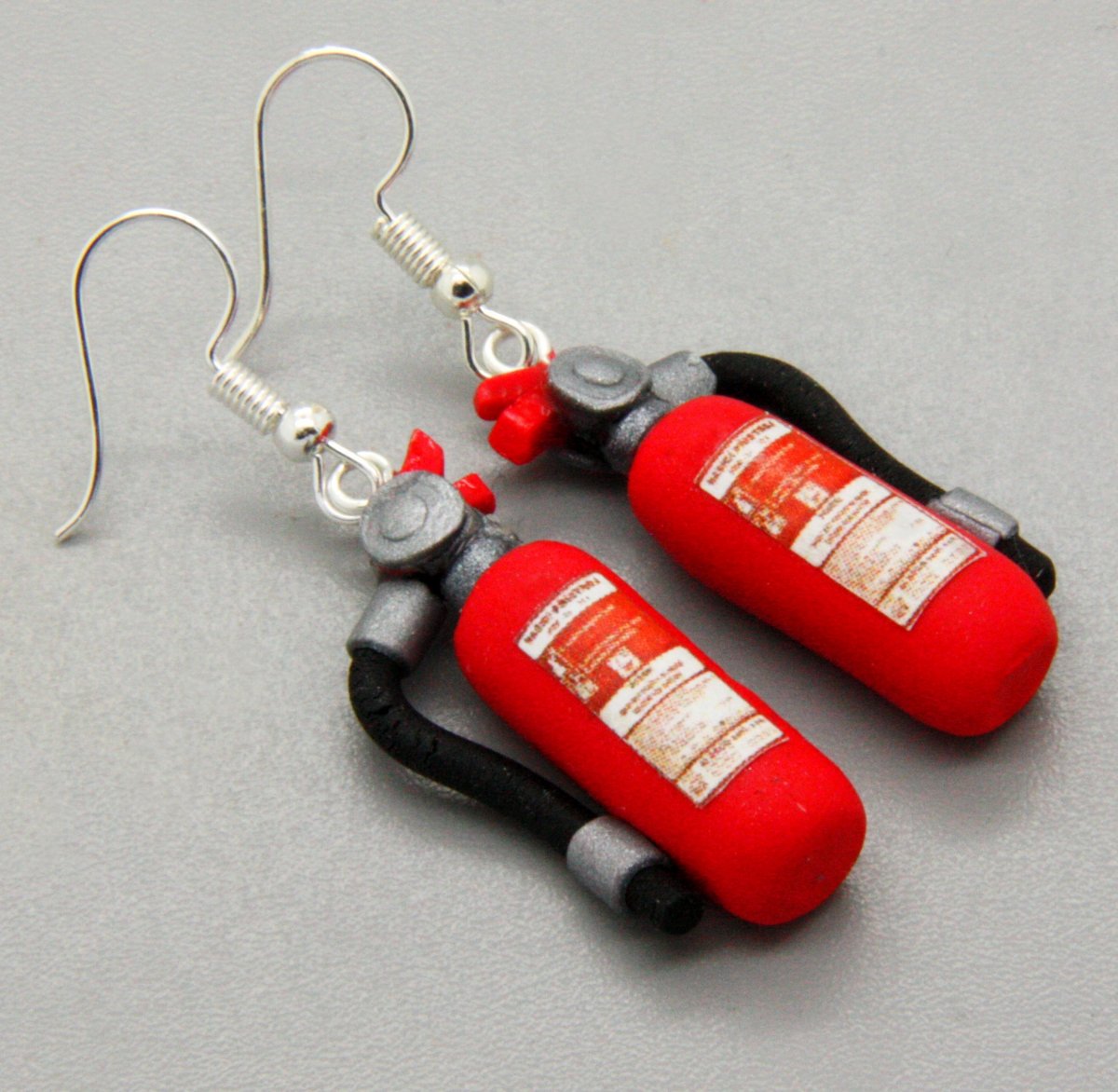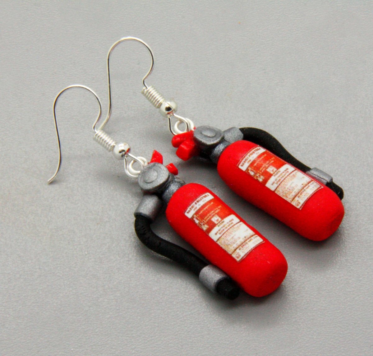 ručně modelovaný šperk z polymerové hmoty ve tvaru hasicího přístroje, vtipný šperk při doprovodu partnera na hasičský ples :-),