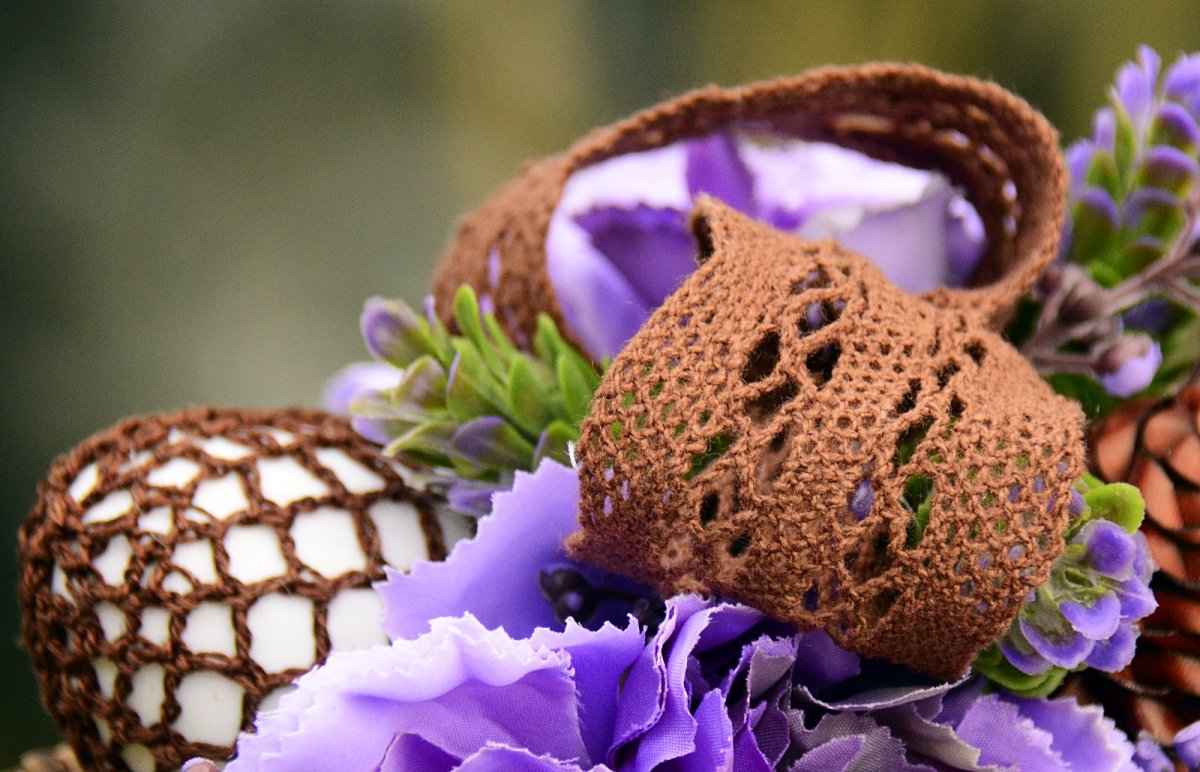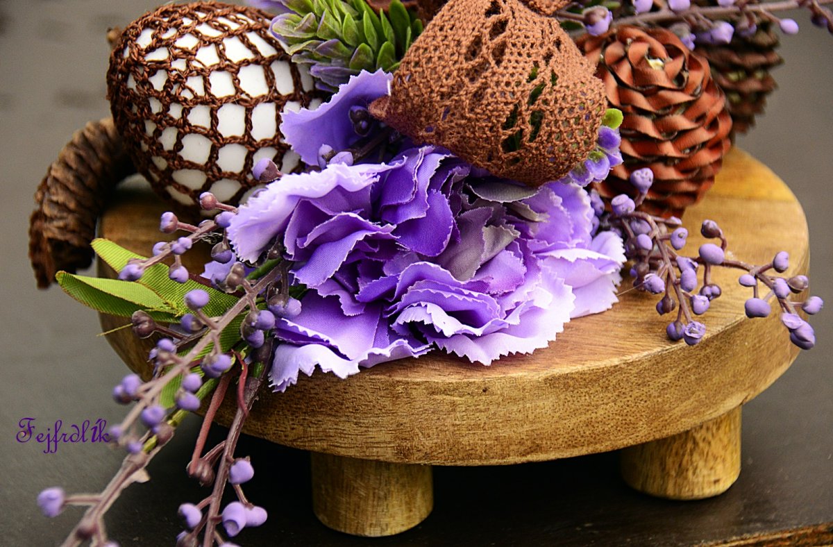 Originání velikonoční aranžmá s látkovými karafiáty, sušinou a oháčkovaným vajíčkem.