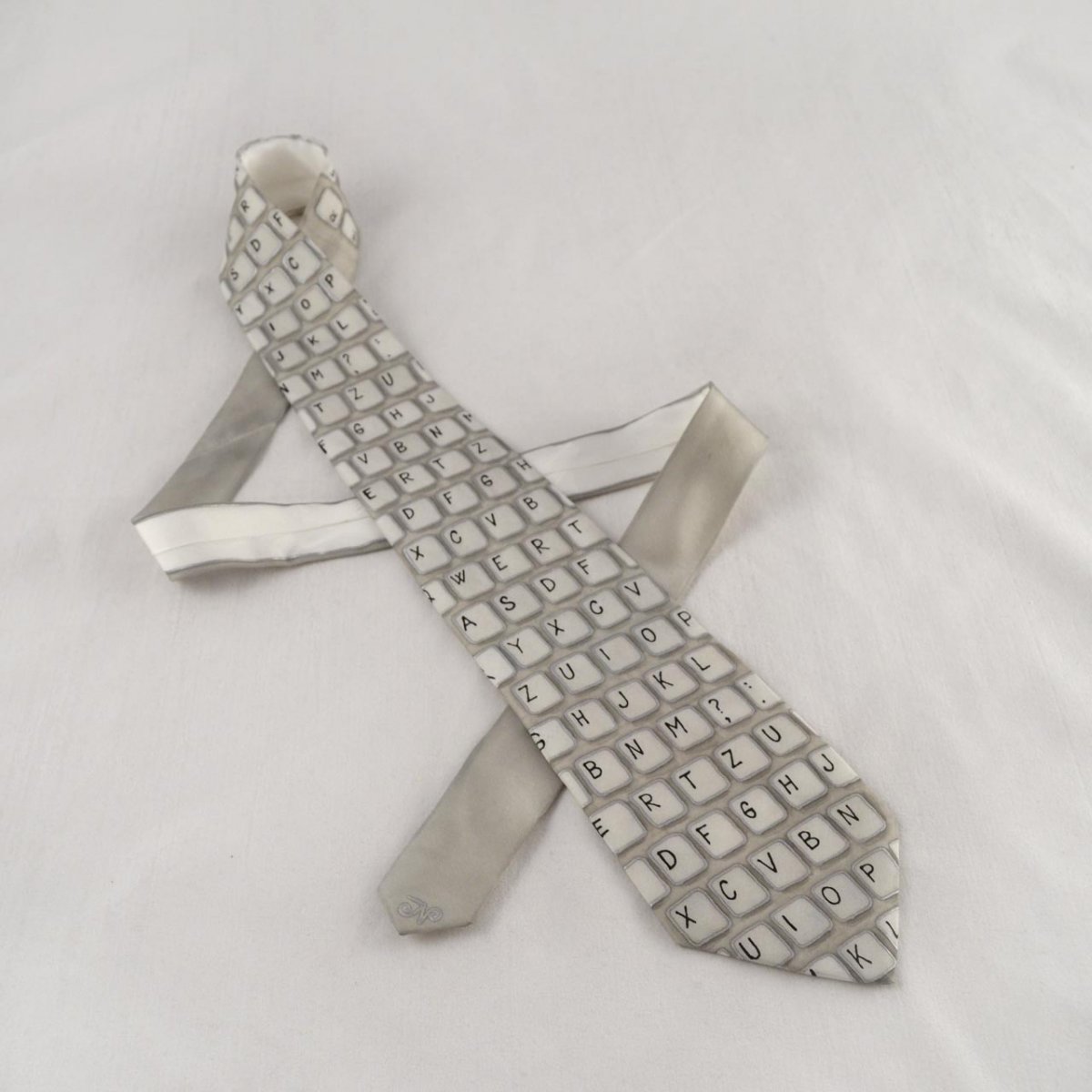 Ručně malovaná hedvábná kravata v šedých odstínech s motivem klávesnice, černá a stříbrná kontura, bílá zadní strana, rozměr 9,5 x 140 cm, 100% přírodní hedvábí Habotai 8.