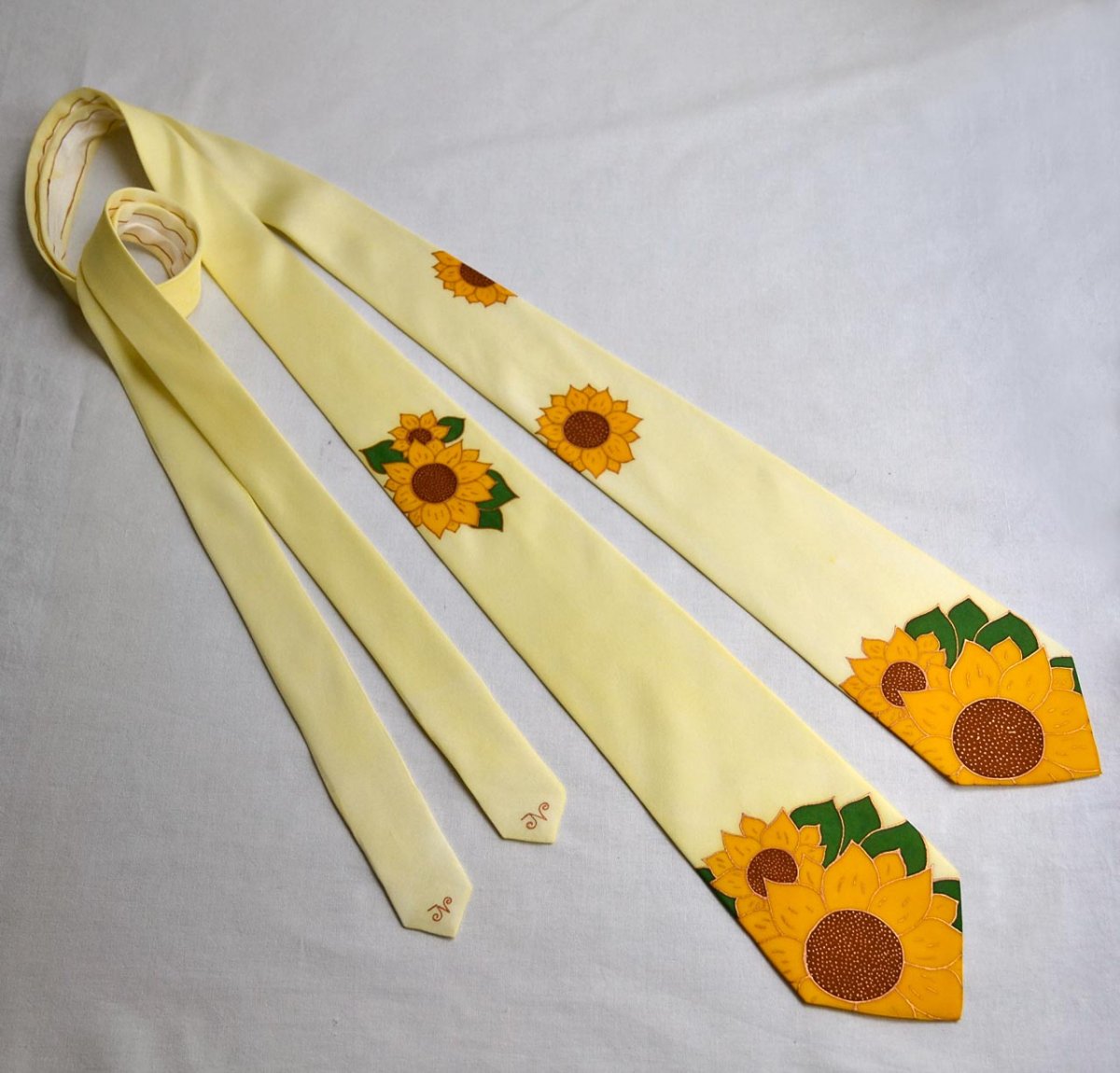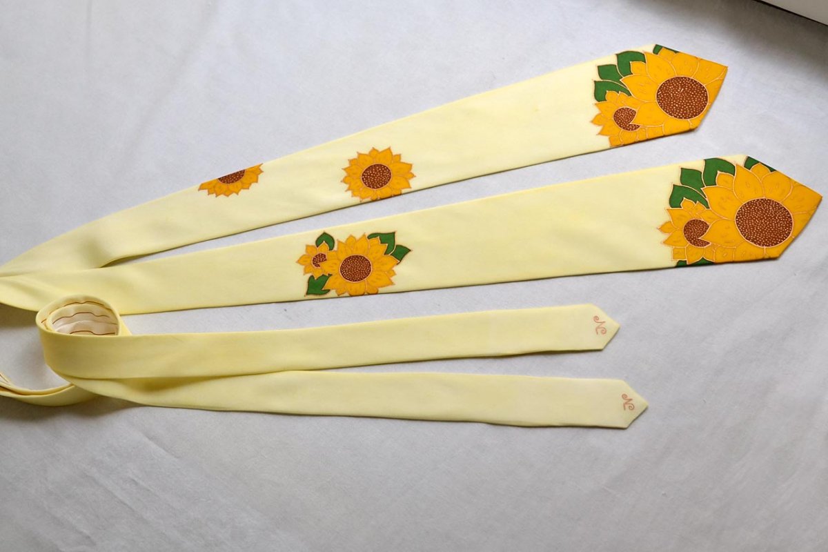 Ručně malovaná hedvábná kravata s motivem slunečnic, rozměr 9,5 x 140 cm, 100% přírodní hedvábí, světle žlutý podklad, měděná kontura.