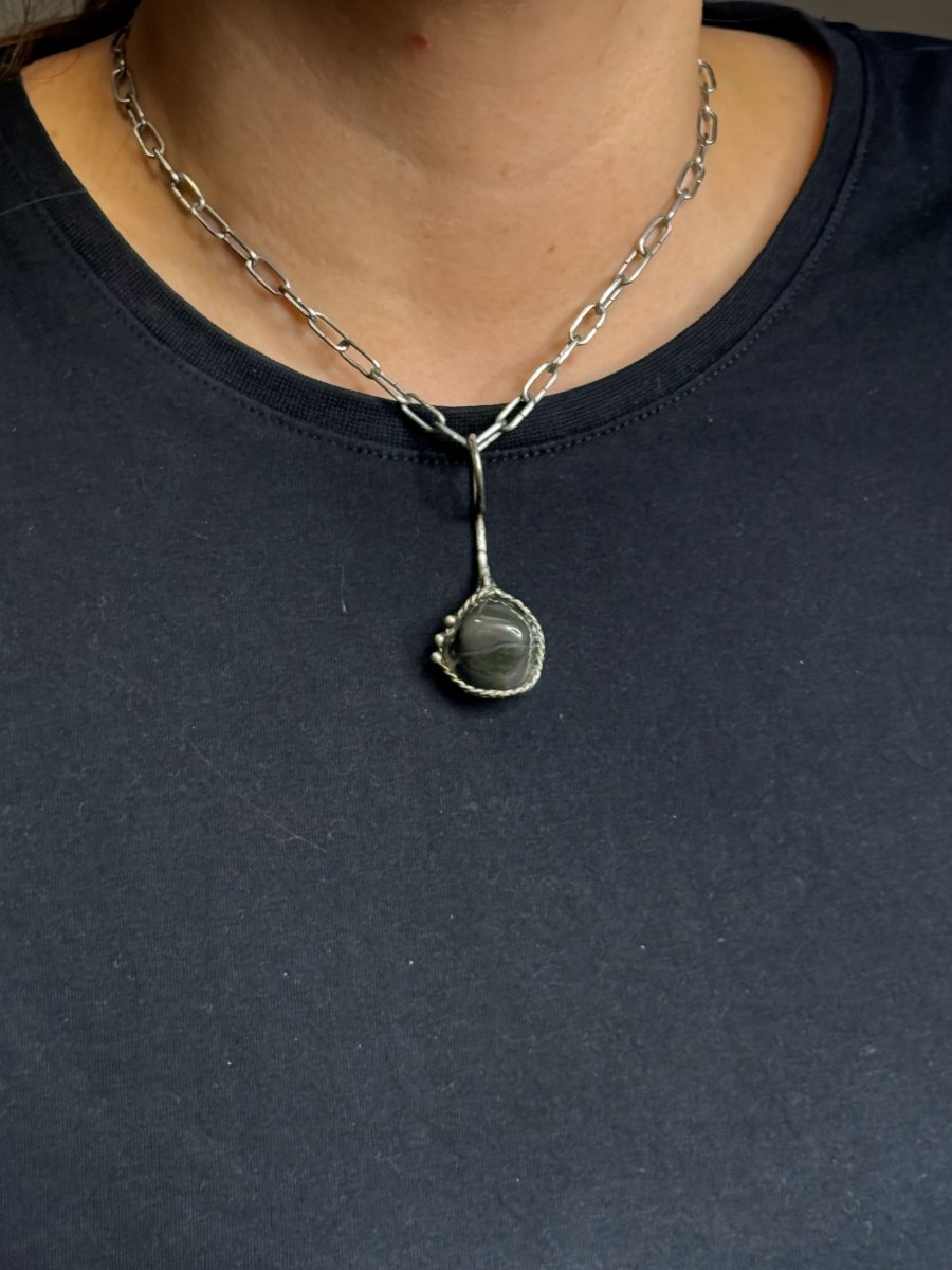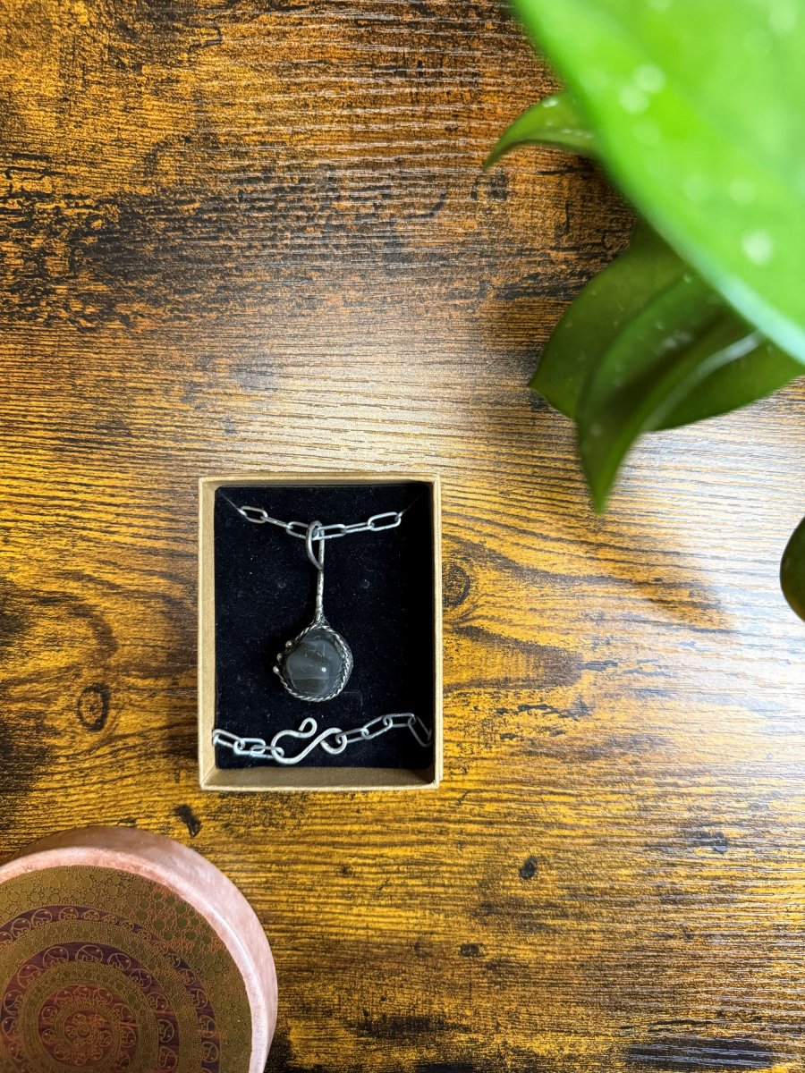 Vyrobeno z bezolovnatého cínu. Černá patina, obroušena, takže dává šperku starostříbrný vzhled. Vše ošetřeno antioxidačním olejem a vyleštěno karnaubským voskem.