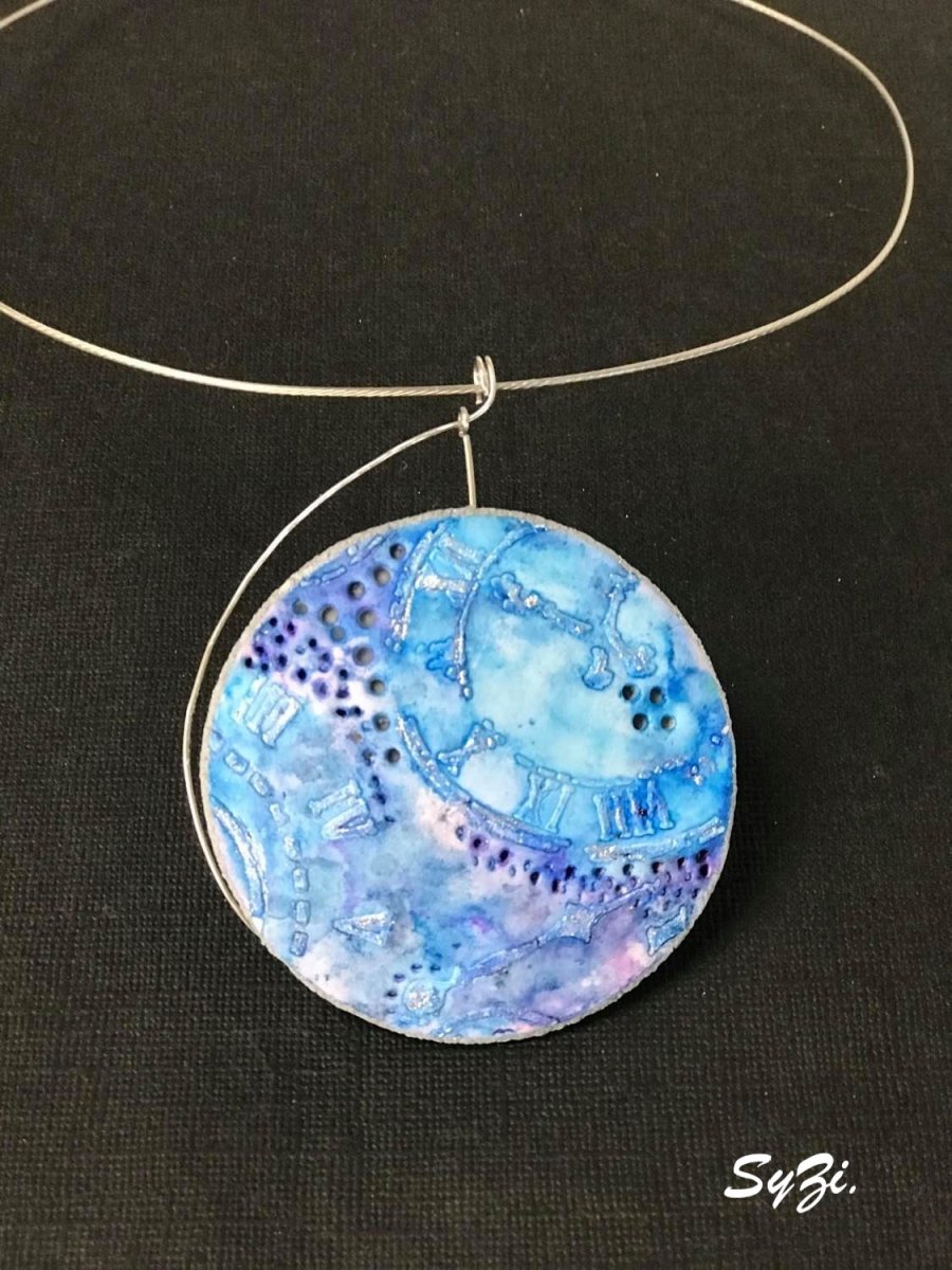 Kulatý náhrdelník se speciálním zavěšením o velikosti cca 6 cm v modrých barvách s jemnými tóny levandulové a stříbrné, je velmi originálním doplňkem.