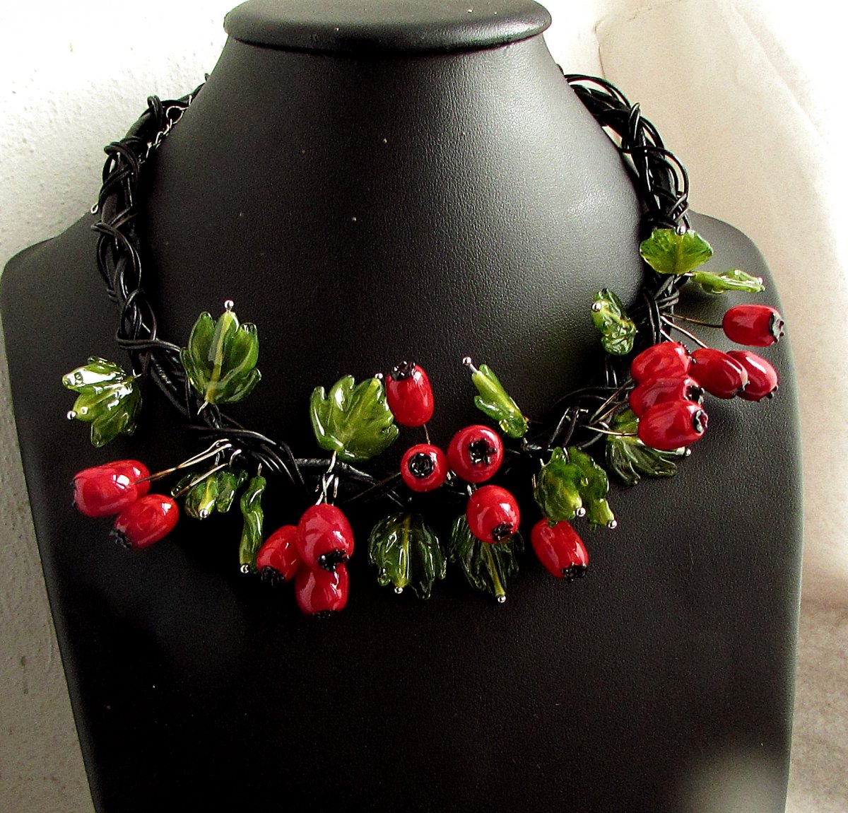 Náhrdelník na kůži, skleněné, ručně vinuté hlohy a lístky