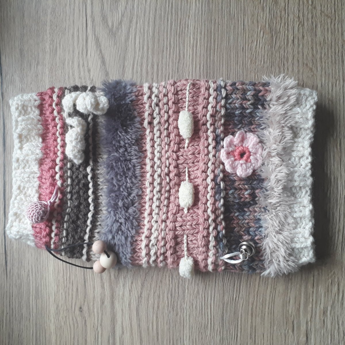 Na druhém ilustračním obrázku je zobrazen rukávník ještě nesešitý, aby bylo dobře vidět všechny komponenty pro hmatovou aktivitu.
