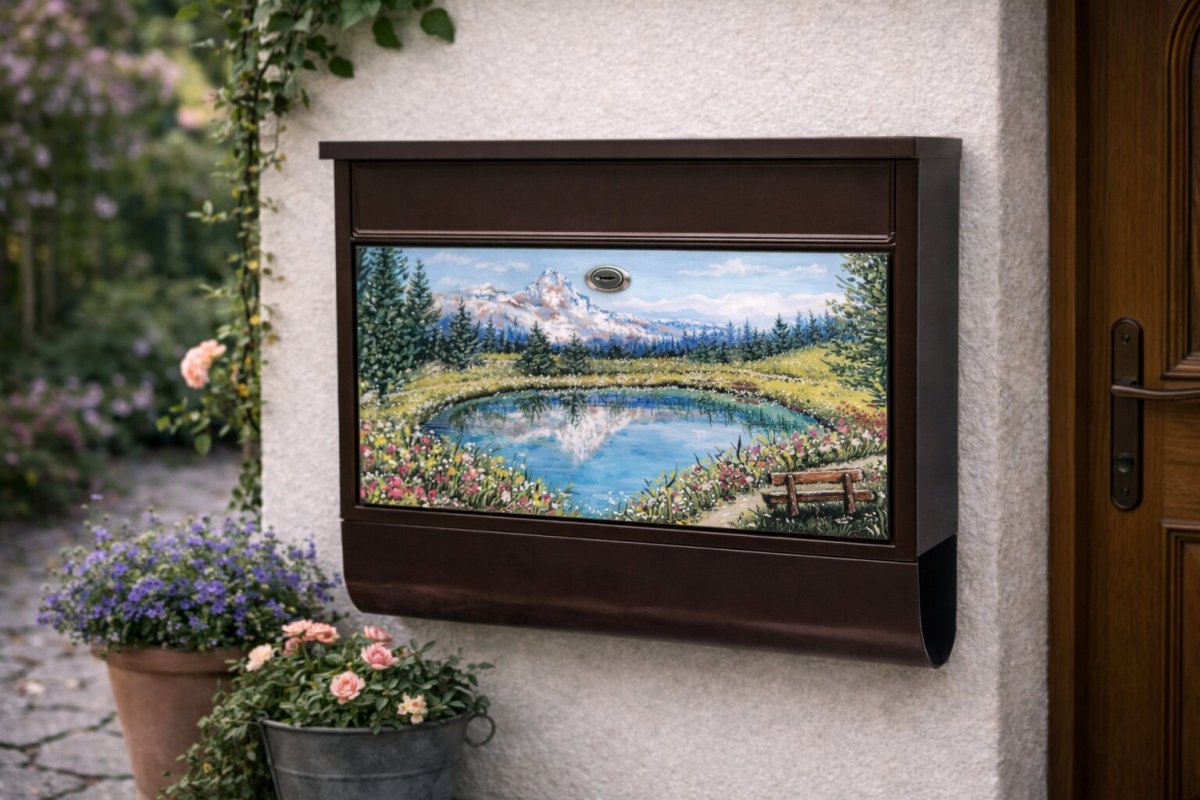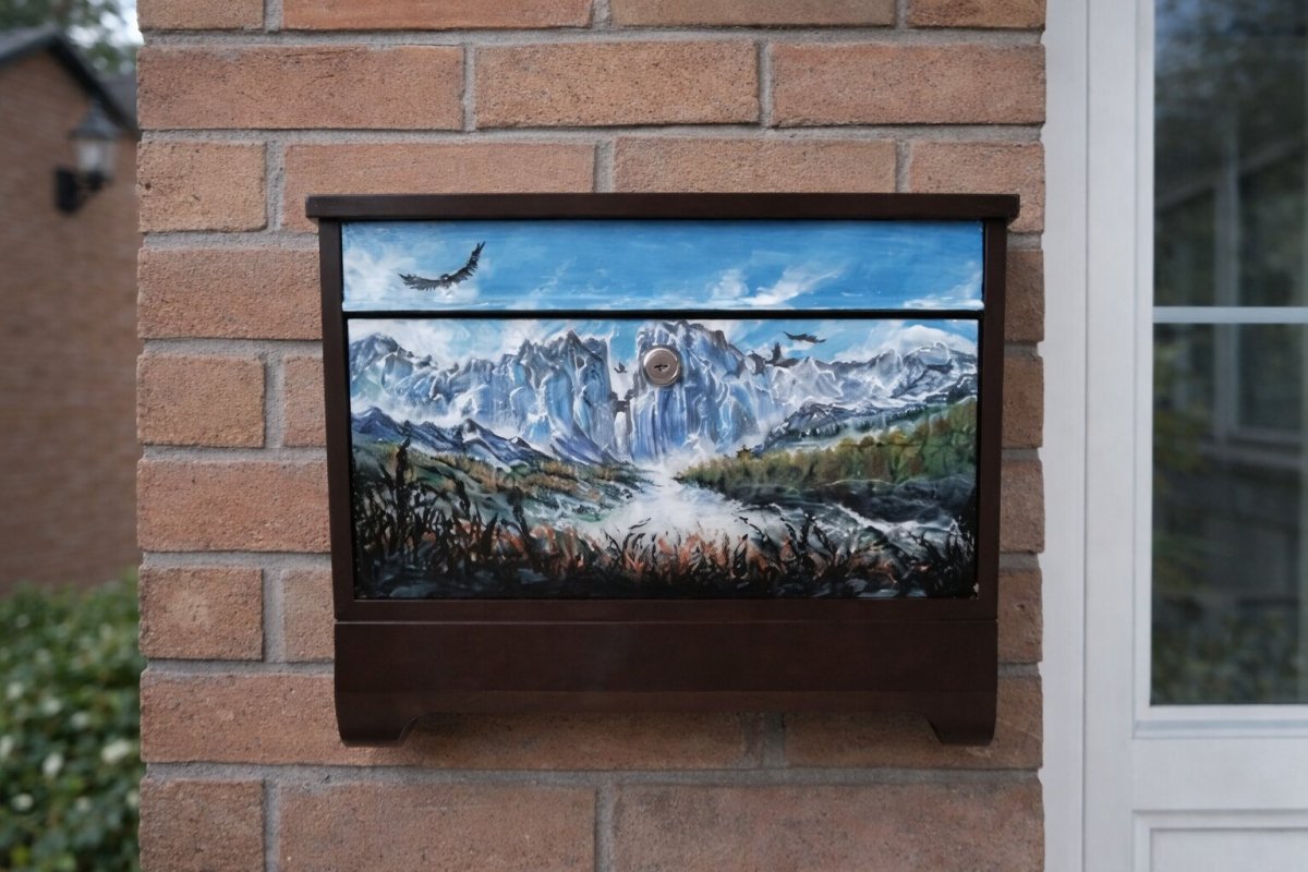 Tato jedinečná ručně malovaná poštovní schránka s motivem horské krajiny je ideálním způsobem, jak dodat exteriéru vašeho domu osobitý styl. Krásně zpracovaná malba zachycuje majestátní zasněžené vrcholky, dravé ptáky v letu a malebné údolí – celek působí harmonicky, originálně a okamžitě upoutá pozornost.
