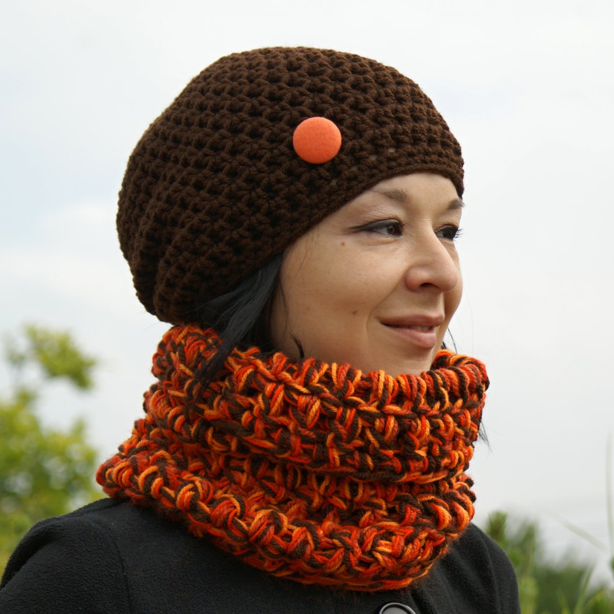 SKladá sa z čokoládovohnedej čiapky ozdobenej malým oranžovým butonikom a nákrčníka na jednop prevlečenie, ktorý melíruje v príjemných jesených farbičkách (prevažne hnedej a oranžovej)