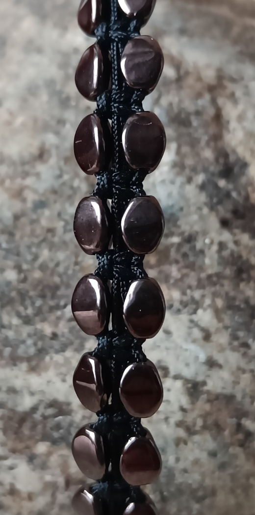 Náramek je vyroben z nylonové šňůry černé barvy. Dále skleněnými korálky krásné lesklé hnědé barvy.