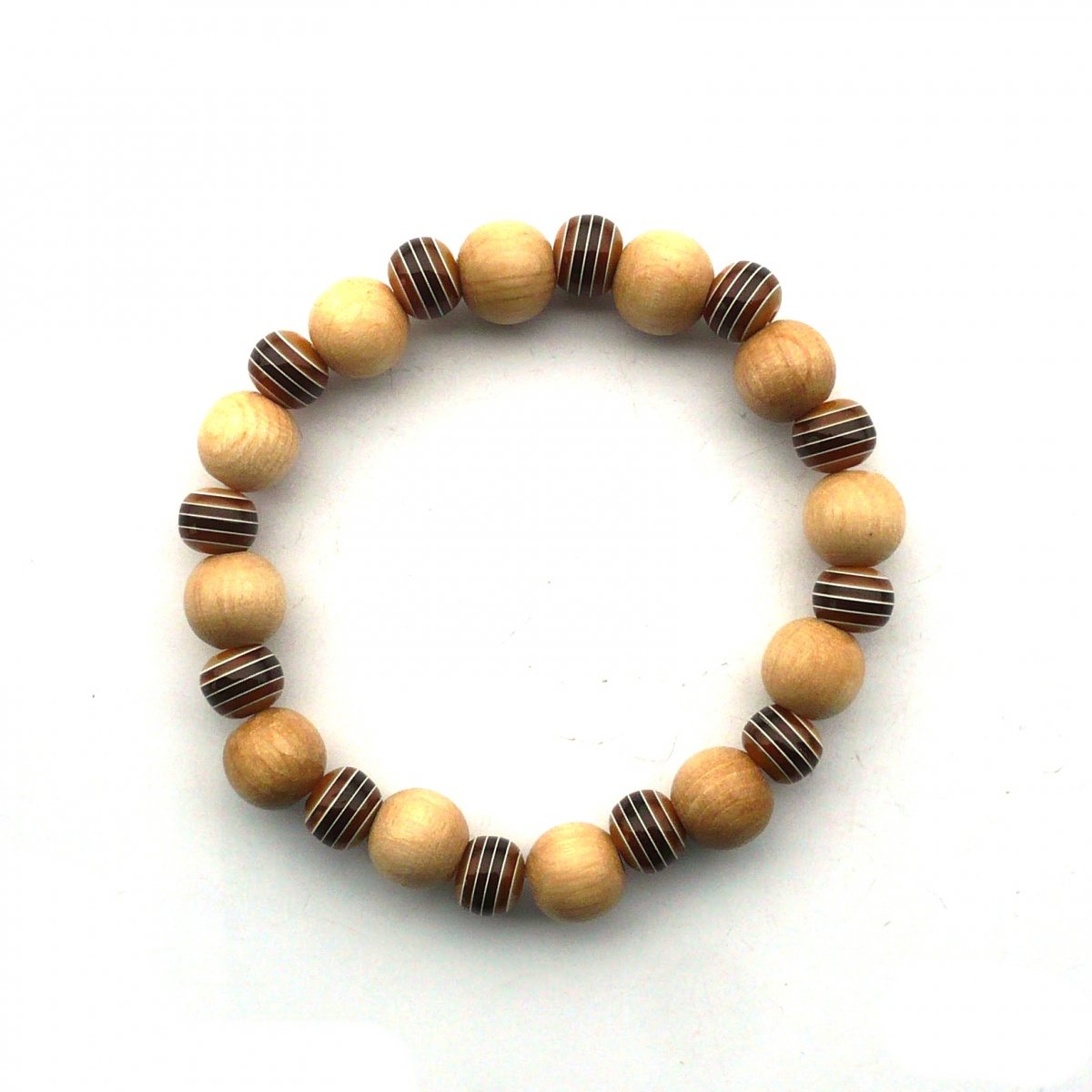 Náramek je vytvořený ze světle hnědých dřevěných korálků a proužkatých plastových korálků.