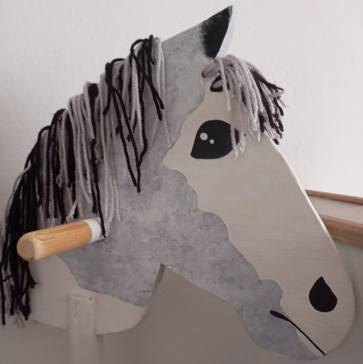 Ručně malovaný a vyřezaný koník na tyči s madlem.