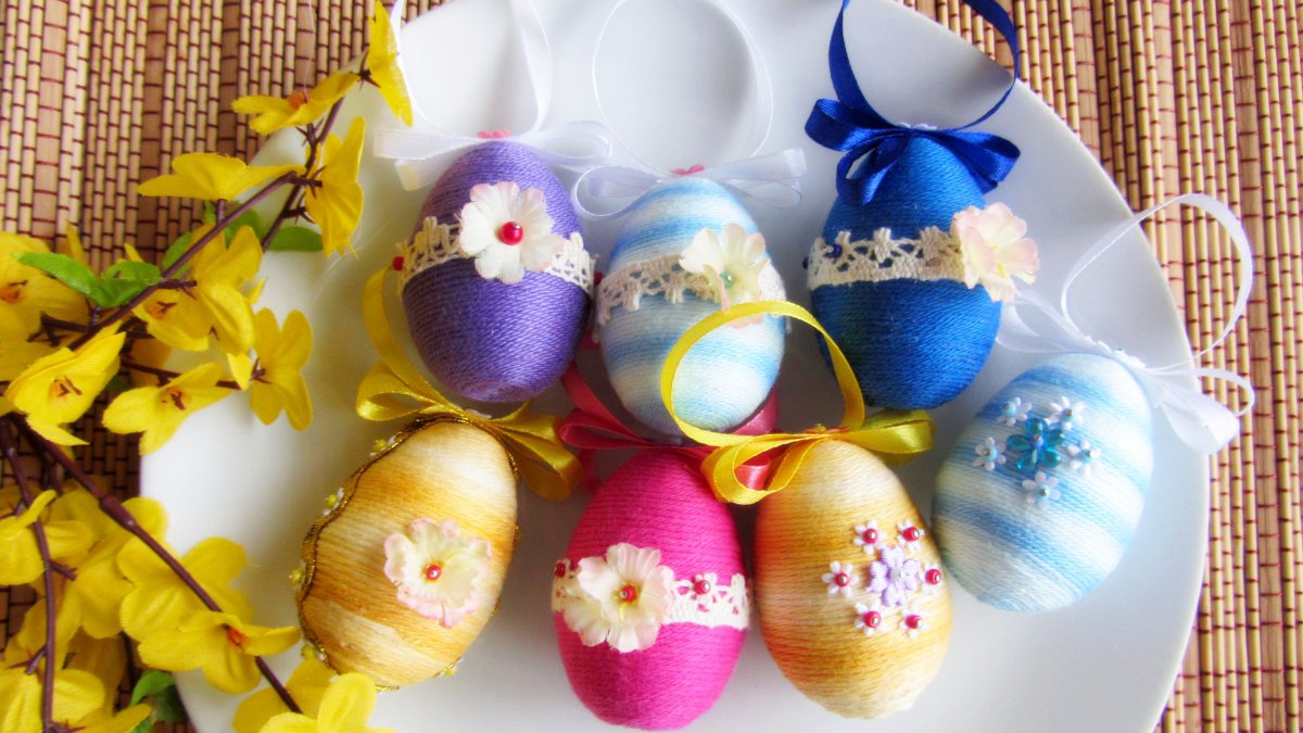 Velikonoční polystyrenová vajíčka o velikosti 6 cm jsou omotána bavlněnou přízí. Zdobena korálky,látkovými kytičkami,korálky,krajkou a stuhou. Vajíčka mají mašličku na zavěšení.