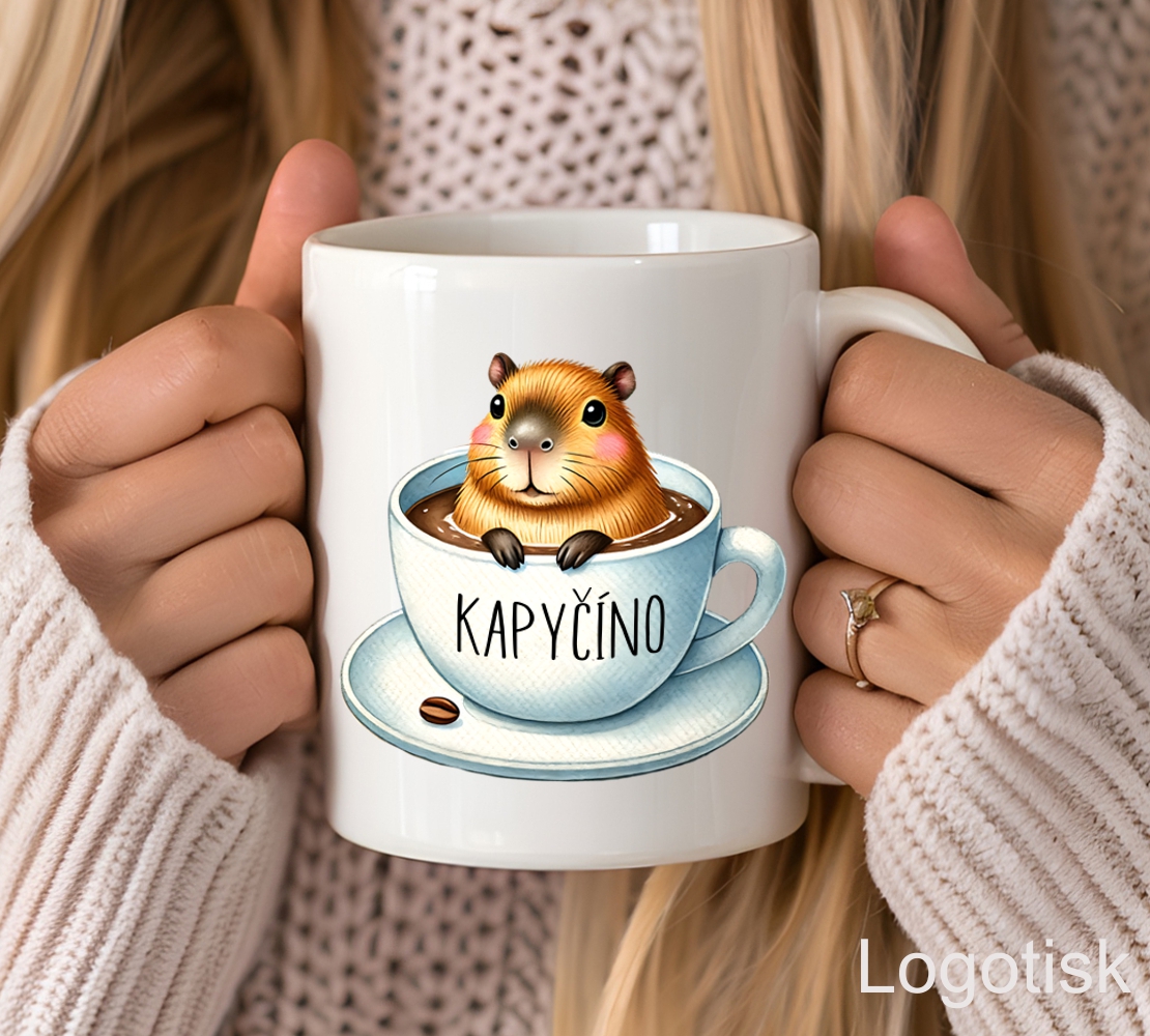Vtipný potisk na hrníček s Kapybarou. CAPYCCINO, nebo KAPYČÍNO. Doplňte si hrníček z druhé strany jménem, nebo vaší fotografií, věnováním. Skvělý nápad na dárek, který zaručeně vykouzlí úsměv na tváři.