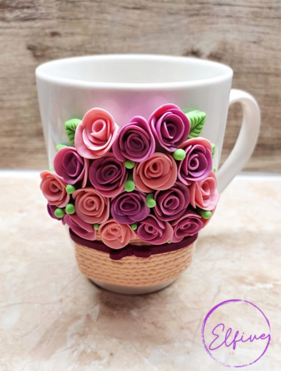 Hrníček je zdoben polymerovou hmotou, s motivem koše s květinami.