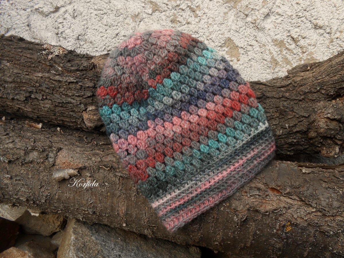 Ručně háčkovaná pokrývka hlavy s pestrobarevnými přechody. Příze je hřejivá s krásnými přechody sladěných barev zelených, šedých, kaštanových odstínech.