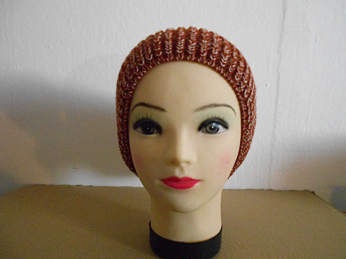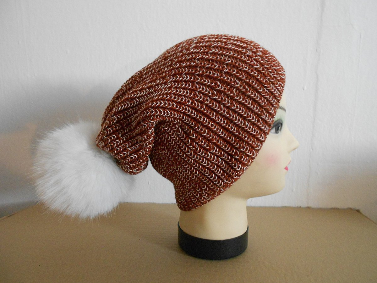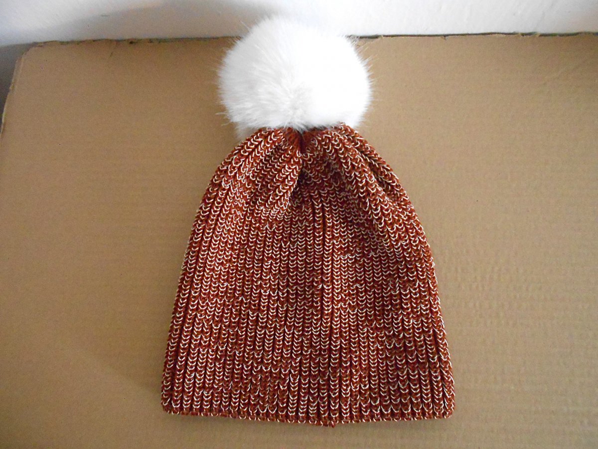 Strojově pletená, ručně dokončená, teplá, pružná čepice - hučka, 80%merino, 20%akryl, výška 24 cm, obvod hlavy 55-60cm, rezavá+béžová melír, s odvazovací 12 cm velkou, bílou bambulí z umělé kožešiny.