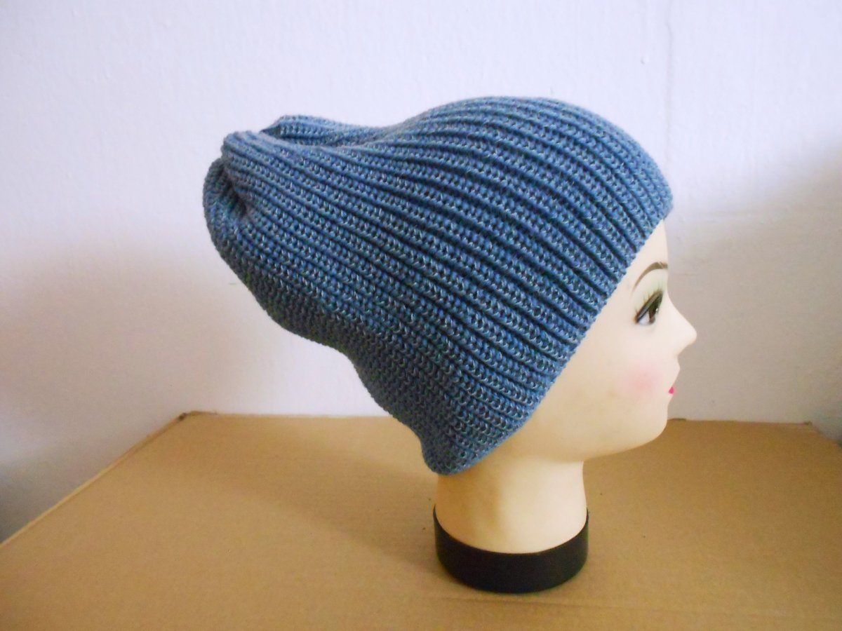 Strojově pletená, teplá, pružná čepice - hučka, 80%vlna, 20%akryl, výška 24 cm, obvod hlavy 54-58cm, modrá melír.