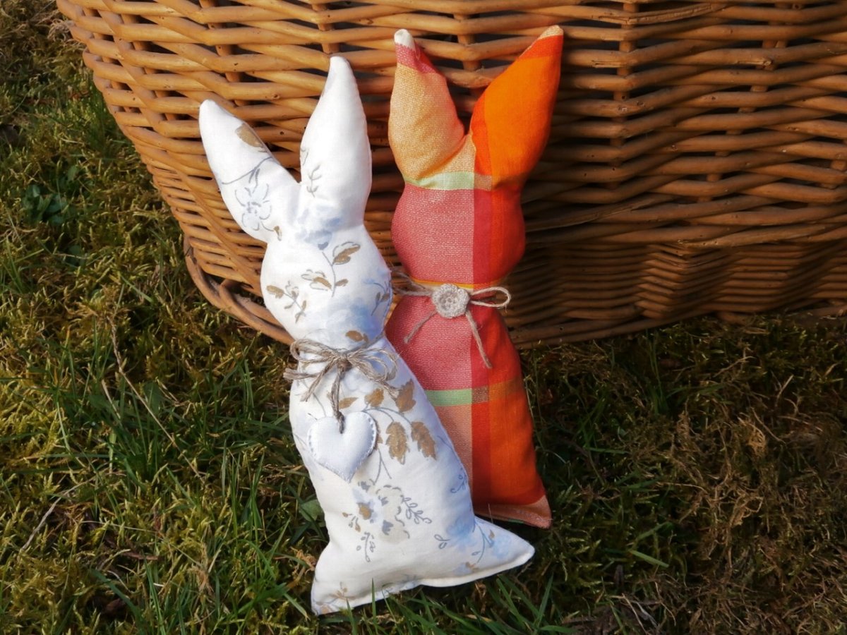 Jsem látkový zajíček přizdobím vám velikonoční ošatku,stůl či košíček.