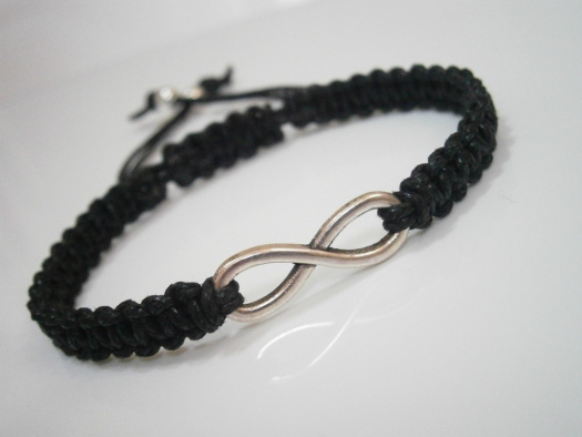 Náramek je vyroben z černé voskované bavlněné šňůrky, kovových korálků a kovového komponentu - nekonečno.