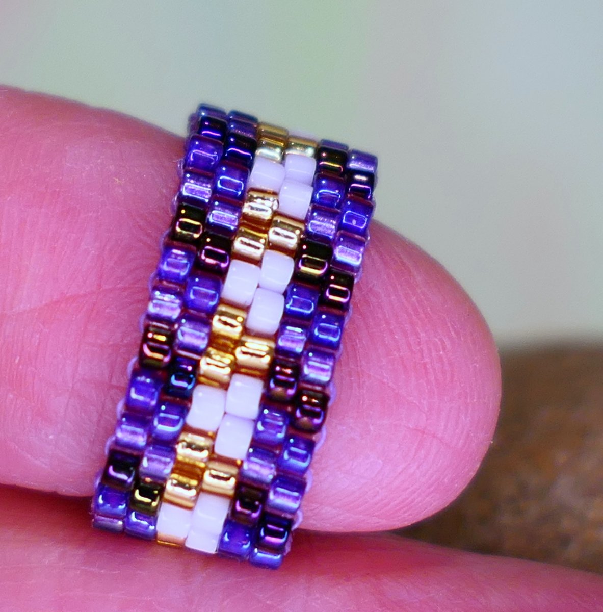 Šitý prsten z velmi kvalitních japonských korálků Treasure a Miyuki v barvě několika odstínů fialové, dále v bílé a zlaté barvě. Vzor není po celém obvodu. Šířka prstenu 0,8 cm.