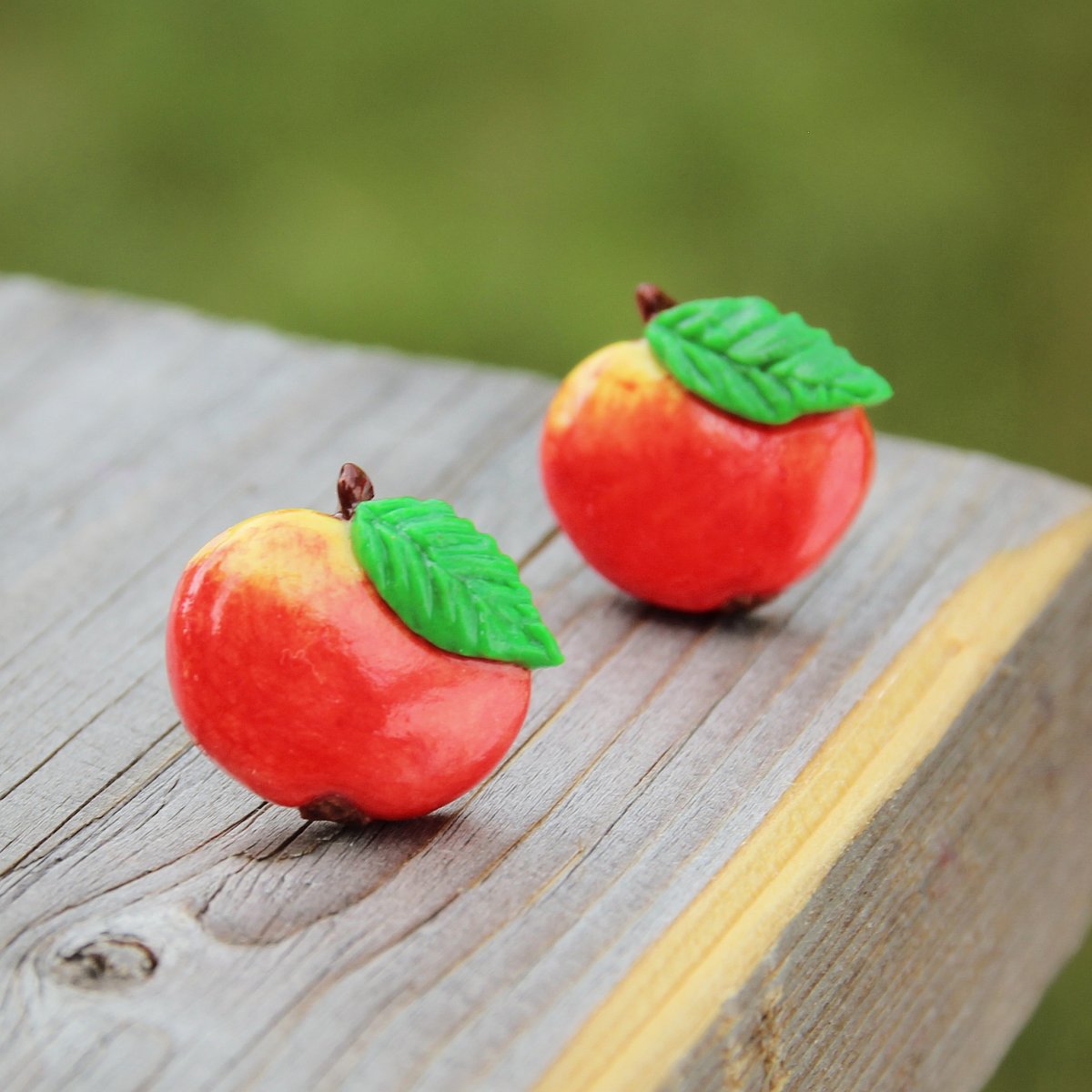 Náušnice s jablíčky z polymerové hmoty (1,5 cm), gumové zarážky.