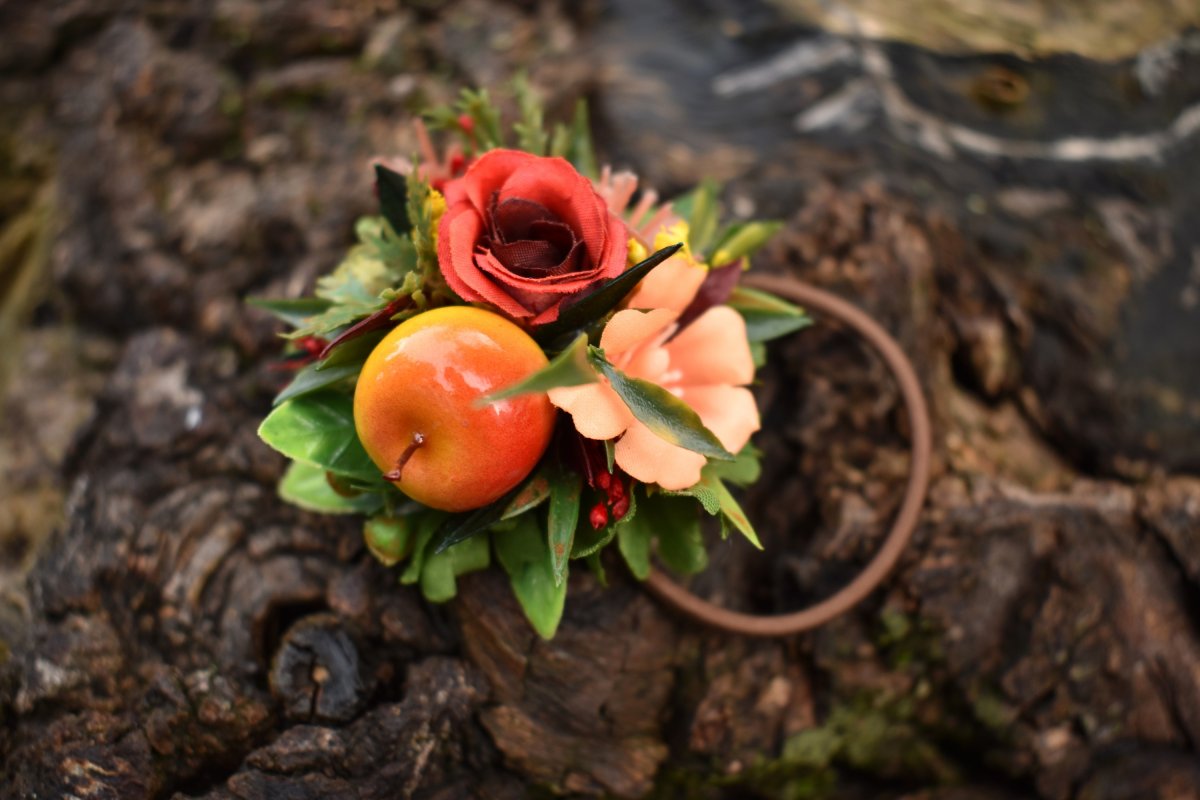 Jde o hnědou bezešvou gumičku s květinovou ozdobou, která je vyrobena z látkových květin, jablka a sušených a plastových lístečků a bobulek.