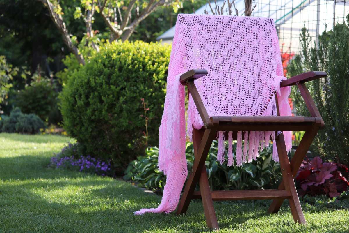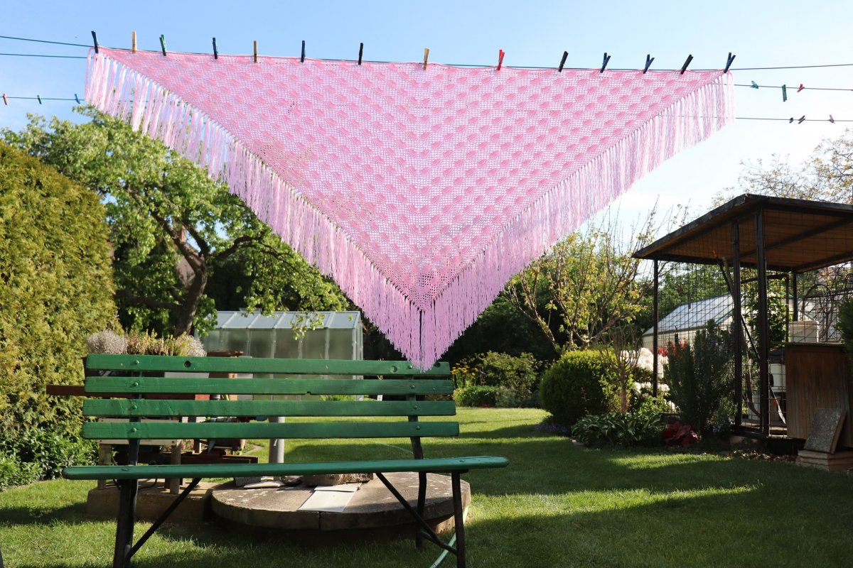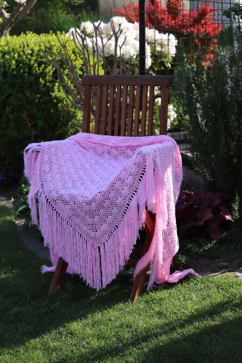 Háčkovaný pléd je vhodným doplňkem k plesové róbě, pro nevěstu, nebo družičku, ale dobrou službu udělá i při letním večerním posezení třeba na zahradě pod pergolkou. Veliký růžový pléd jsem uháčkovala z krásné příze Alize Diva. Pěkný vějířkový vzor se střídá s dírkovými pruhy. Plédek je opravdu veliký.