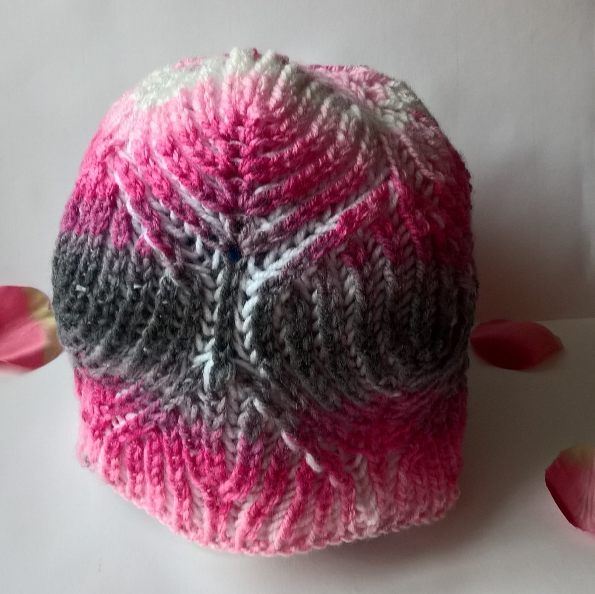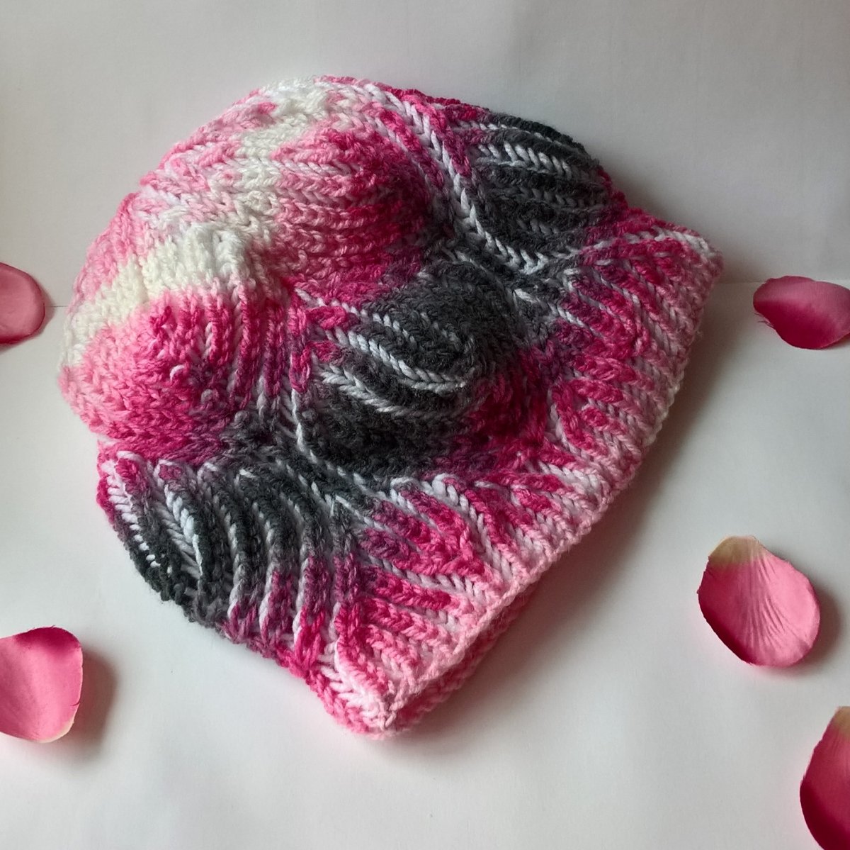 Čepice je ručně pletená dvoubarevným pružným vzorem ve tvaru listů. Čepice je oboustranná, můžete ji nosit podle nálady.