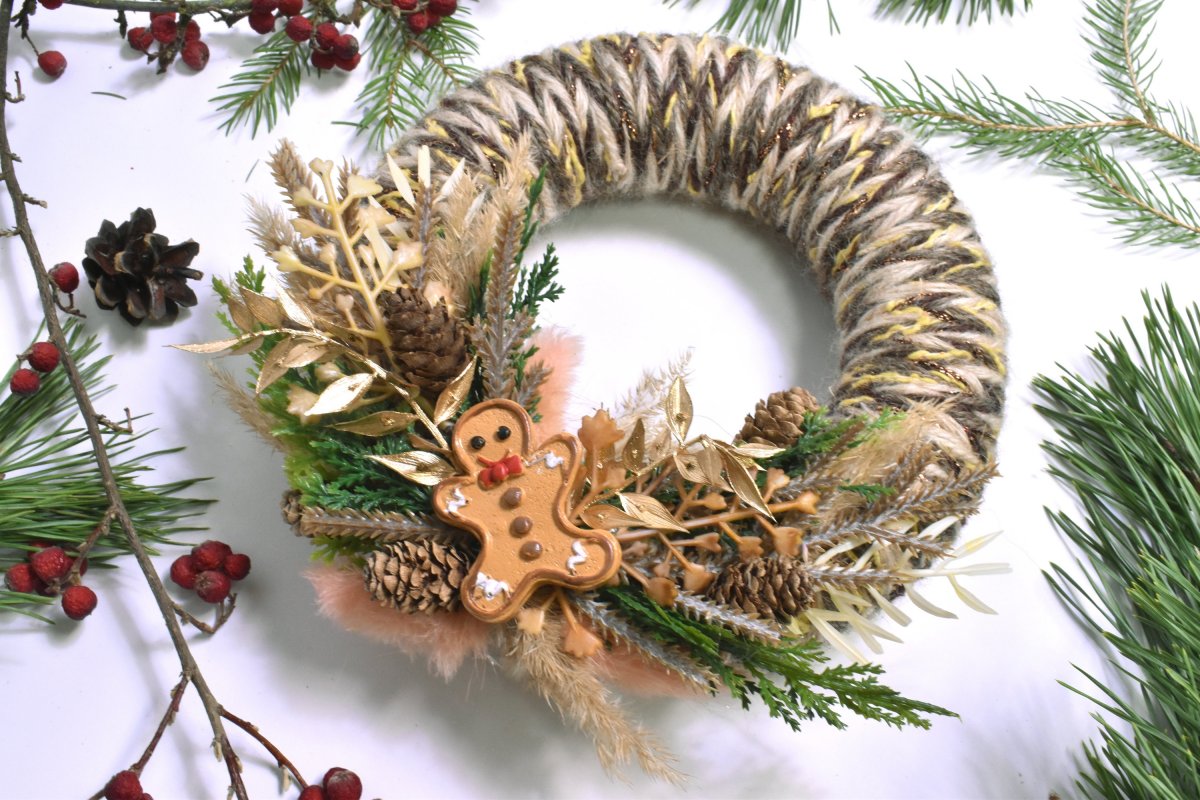 Věnec je potažen vlnou a ozdoba je vyrobena ze stabilizovaných i umělých lístečků, květů, bobulek, šišek, umělého perníčku a plastových jehličnatých větviček.
