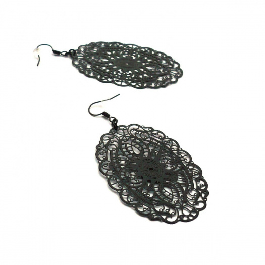 Náušnice jsou z velkého oválného černého vyřezávaného kovového plíšku. Náušnice jsou lehoučké, příjemné a módní.