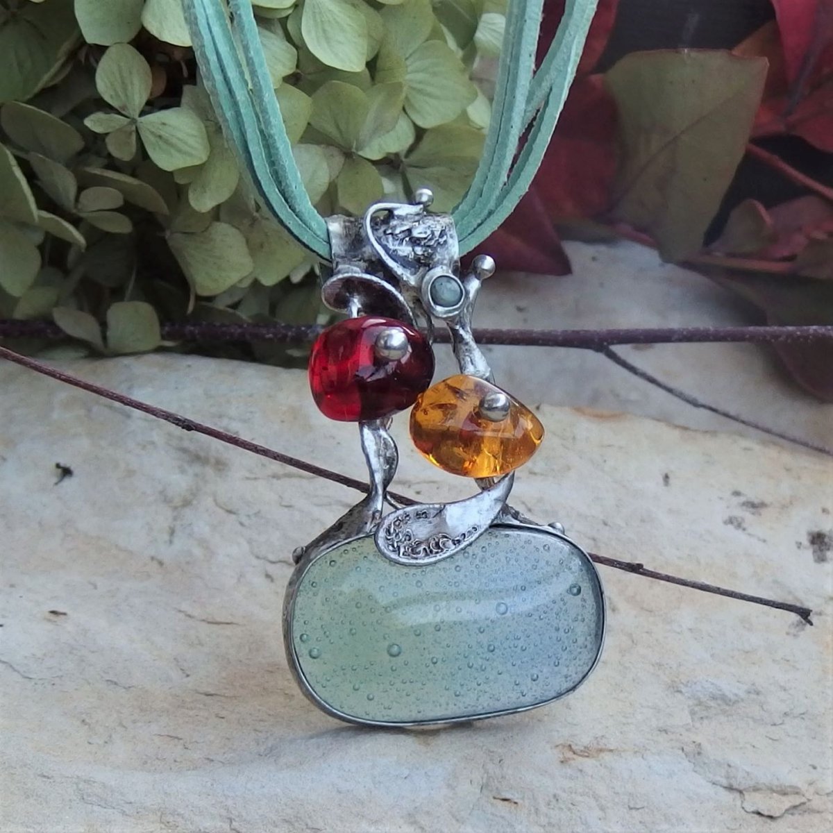 Trošku divočejší náhrdelník s fusingovým sklem a rekonstruovaným jantarem ve dvou odstínech.
