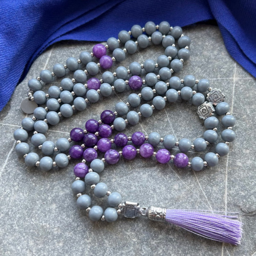 Dlouhé korále - mála - ze 108 korálků - šedých dřevěných a korálků ametystu velikosti 8 mm, proložených stříbrnými malými korálkami na bavlněné šňůrce. Délka 49 cm (x2) + fialový střapec se stříbrným guru korálkem 7 cm.